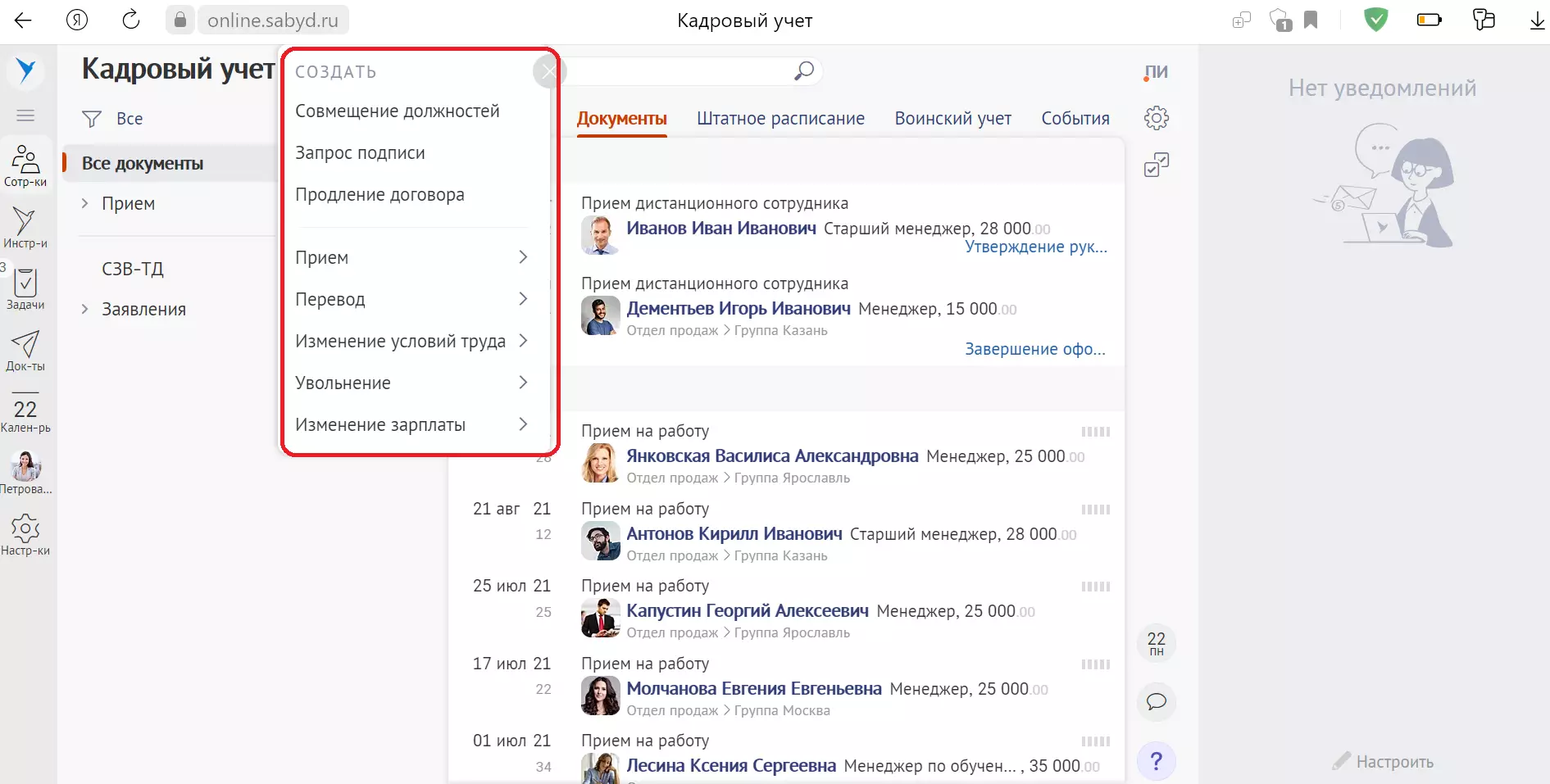 СБИС позволяет как автоматизировать все процессы кадрового учета, так и обеспечить интеграцию с другими системами. Виды документов, которые может создать специалист кадровой службы: