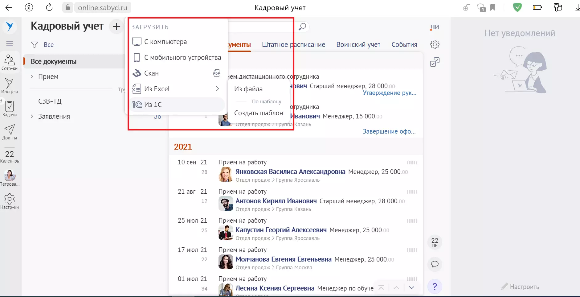 - Заполнить справочник «Сотрудники», где пользователи программы могут быть добавлены вручную или загружены из сторонней системы. СБИС имеет интеграцию со многими системами ведения кадрового учета, в том числе и с 1С.