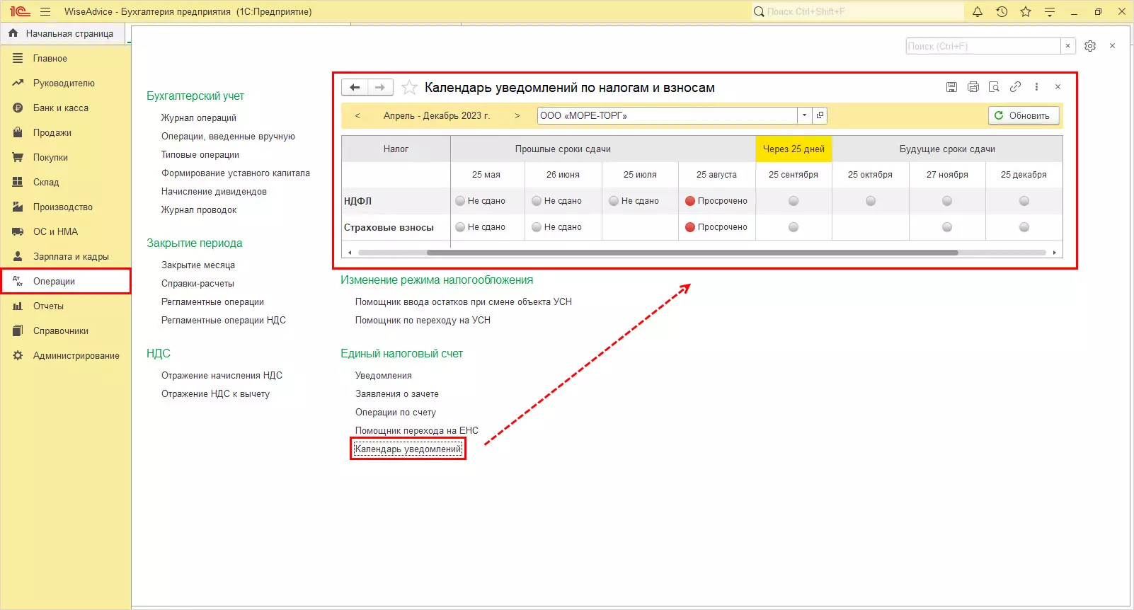 В разделе «Операции» 1С:Бухгалтерии расположен «Календарь уведомлений», который наглядно напомнит о сроках отправки уведомления по имеющимся налогам организации