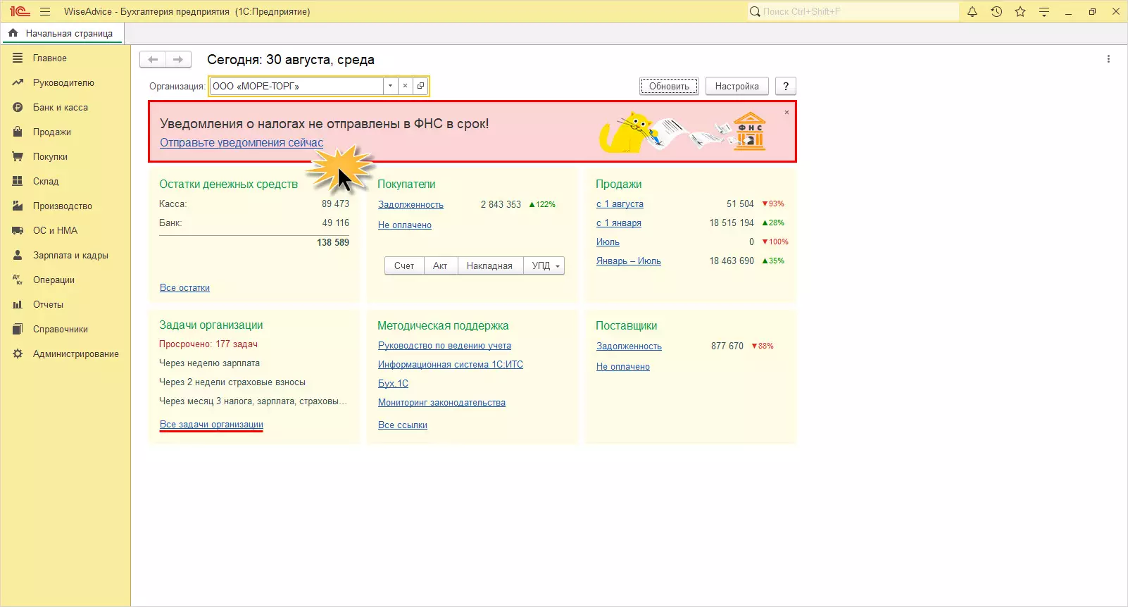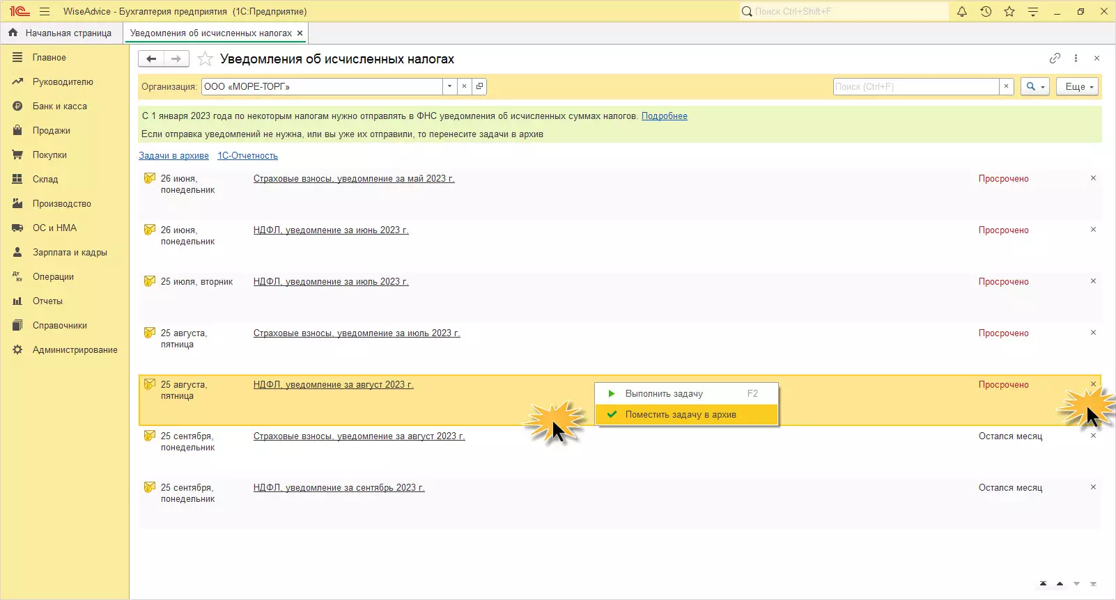 При запуске 1С:Предприятие 8.3 программа контролирует все необходимые действия в соответствии с положенными сроками, предупреждая пользователя о необходимости выполнения той или иной операции.