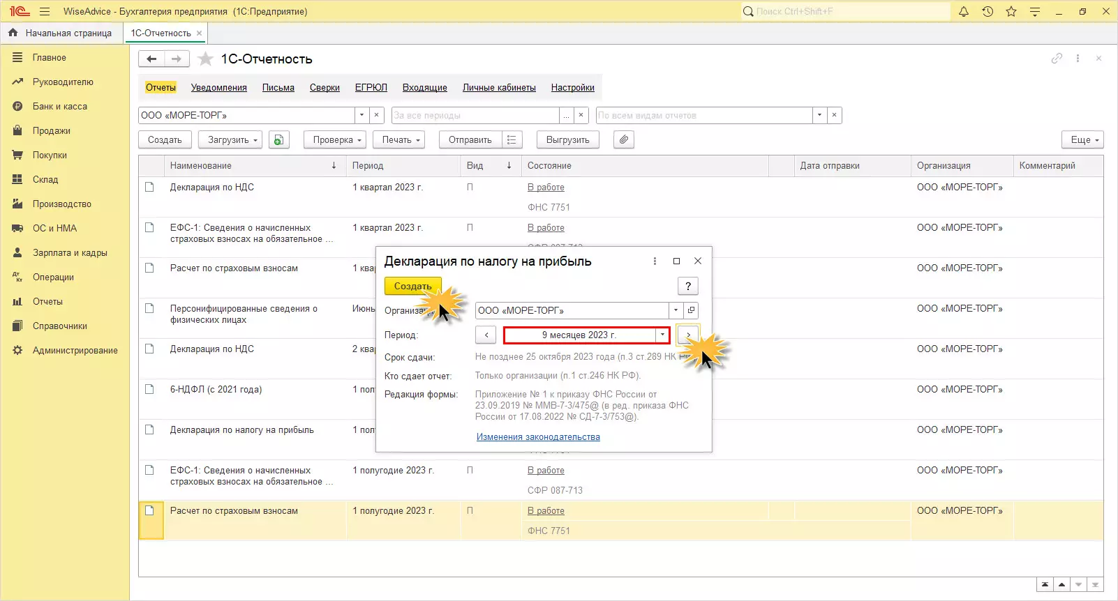 Шаг 2. Указав в открывшемся окне наименование организации, с помощью кнопок выбора периода задайте «9 месяцев 2023».
