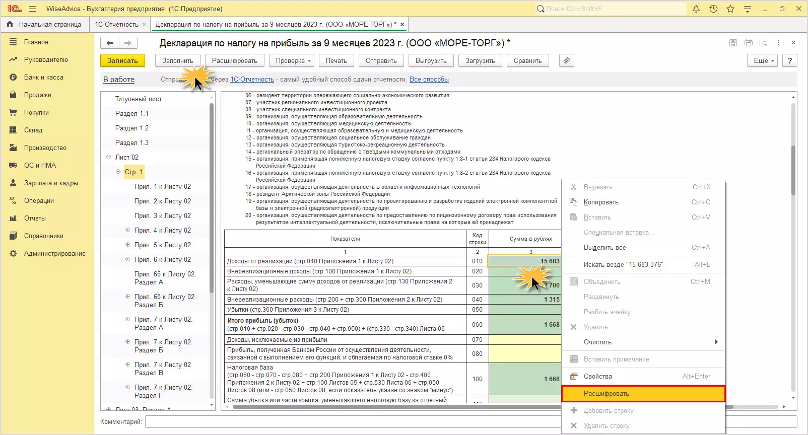 Шаг 3. Нажмите «Заполнить» и просмотрите данные отчета. При нажатии правой кнопкой мышки на ячейке по команде «Расшифровать» (эта же кнопка есть и на панели инструментов отчета) пользователь получит расшифровку суммы ячейки.