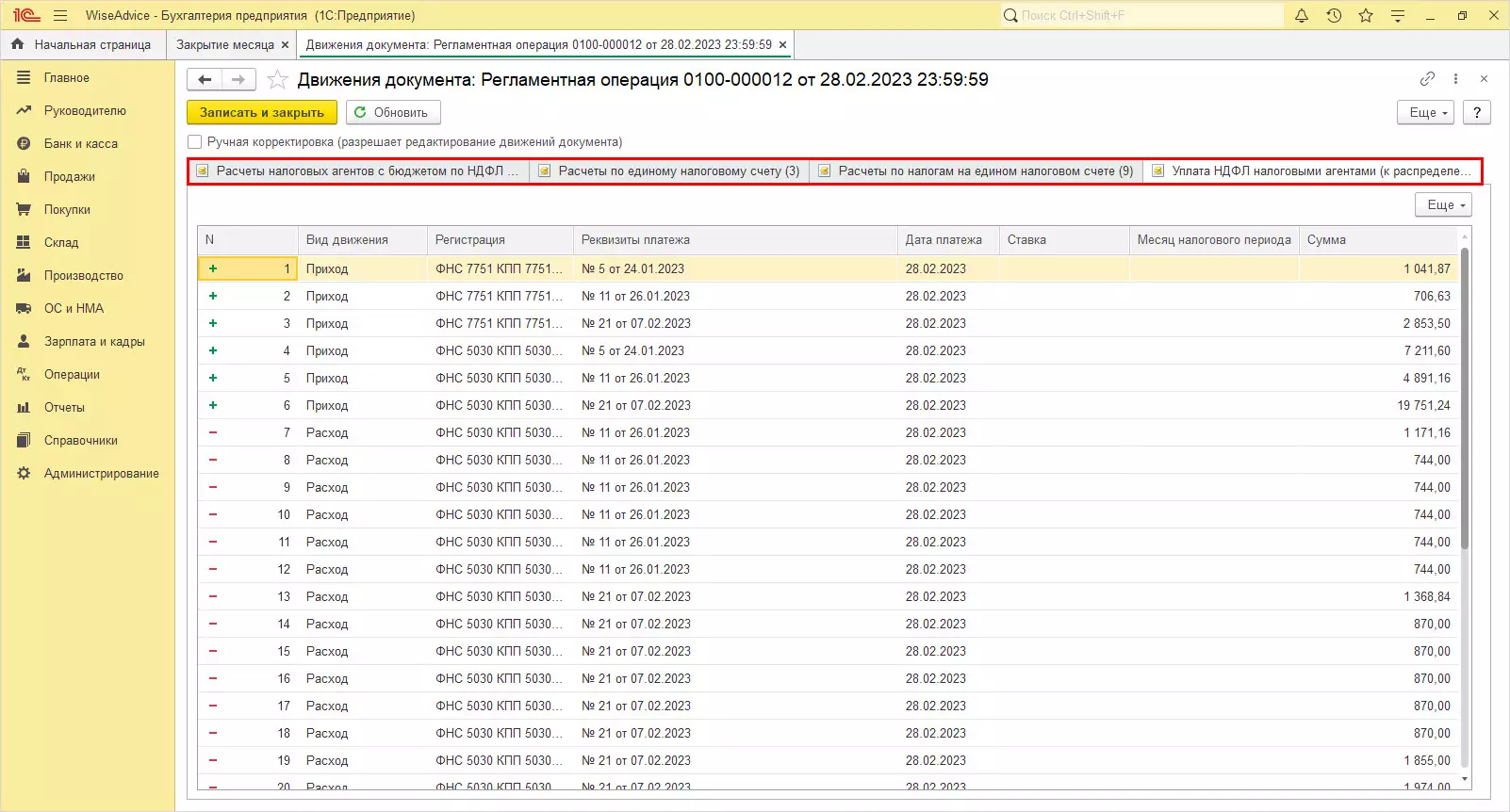 Операция формирует движения по регистрам, на основании которых данные попадают в отчеты. Например, регистр «Уплата НДФЛ налоговыми агентами (к распределению)» формирует в отчетах ячейку НДФЛ уплаченный.