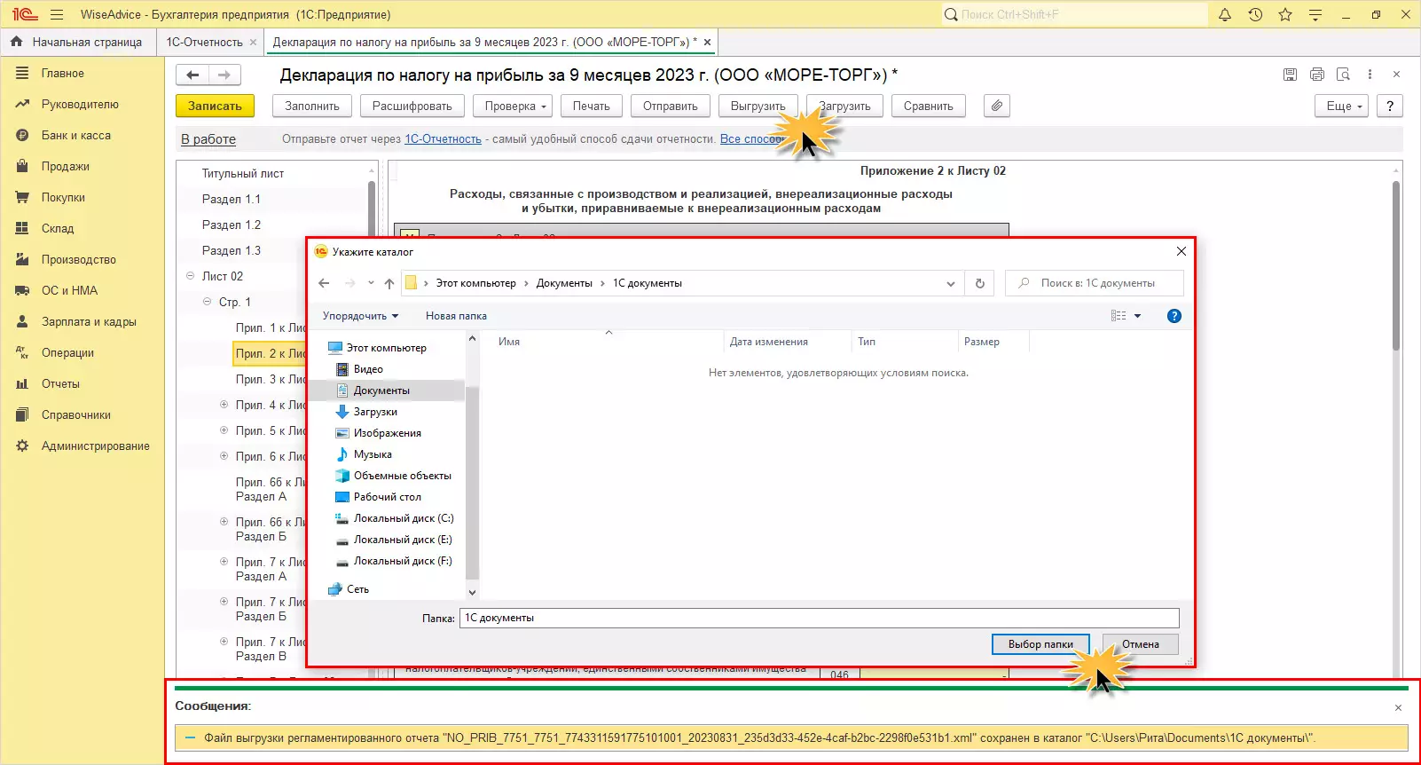 Шаг 4. Нажмите «Выгрузить» и укажите папку-приемник для отчета. По команде «Выбрать» отчет будет сохранен в указанную папку, о чем система проинформирует пользователя сообщением.