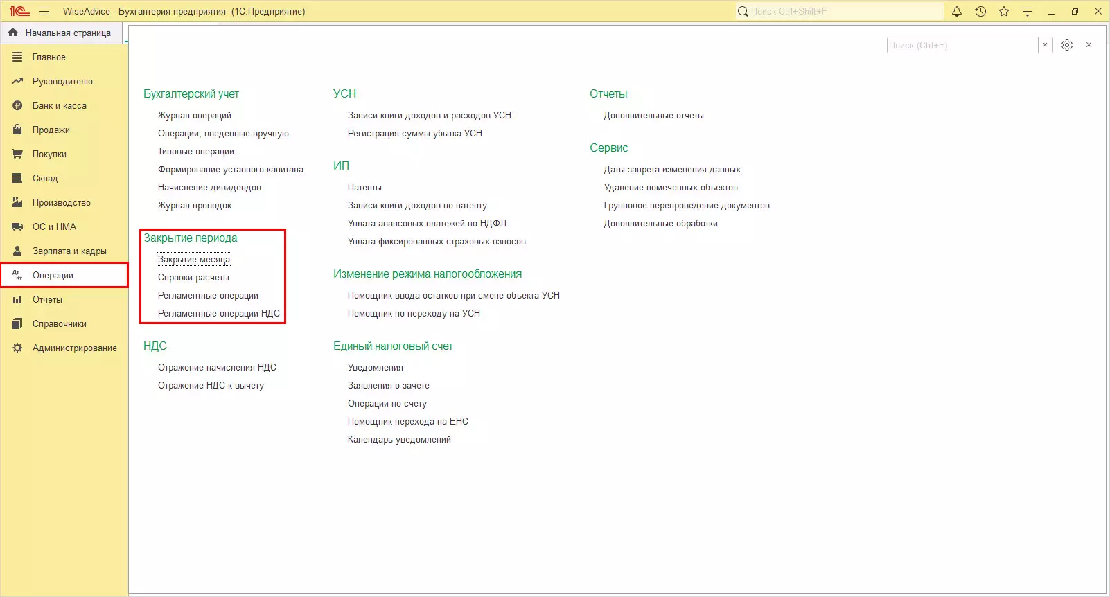 Отразив все операции в учете, необходимо выполнить процедуру «Закрытие месяца» – раздел «Операции». В результате программа формирует необходимый перечень регламентных операций.