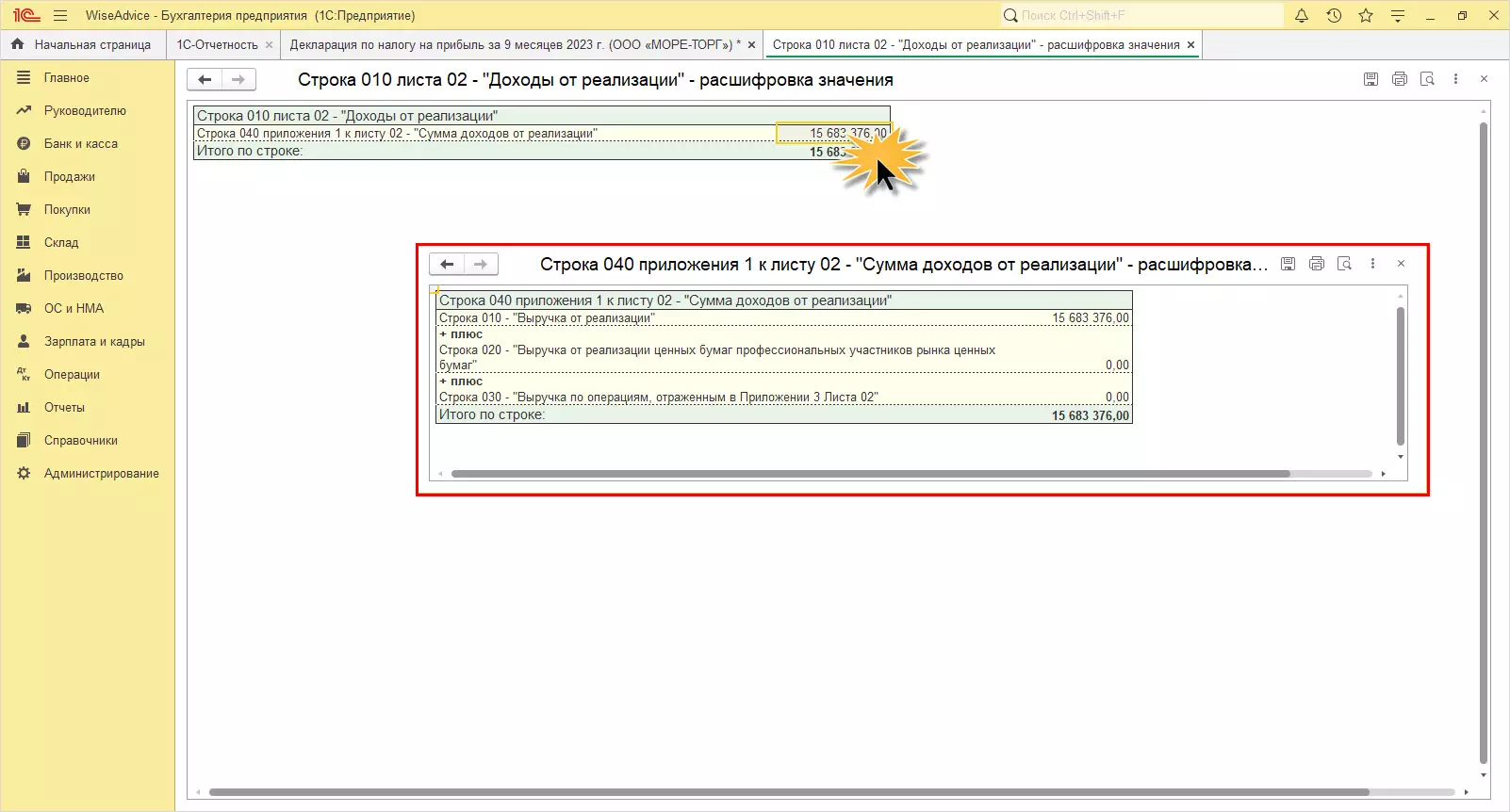 Возьмем для примера отчет «Декларация по налогу на прибыль» организации ООО «Море-ТОРГ».