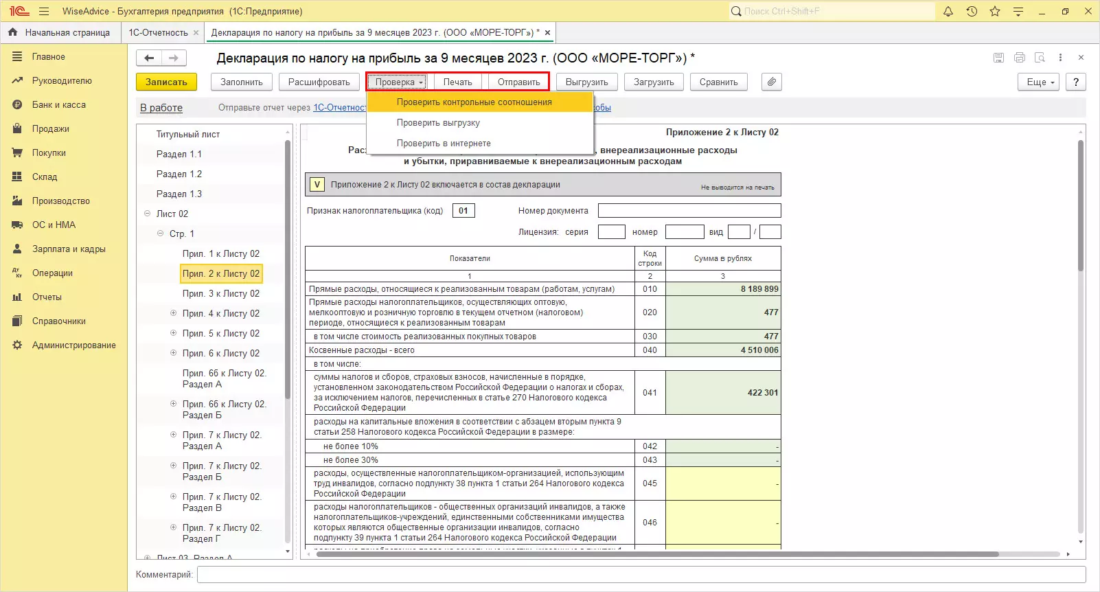 Просмотрев отчет, пользователь может проверить его – кнопка «Проверка», а затем уже отправить непосредственно из программы 1С или отправить с помощью стороннего сервиса, выгрузив в папку своего компьютера.
