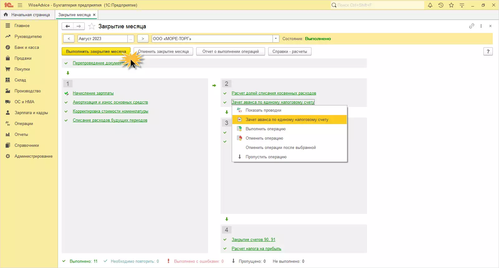 Данная процедура предшествует формированию отчетности, так как без нее формирование некоторых отчетов будет некорректно. Например, операция «Зачет аванса по единому налоговому счету» – новшество 2023 года. Выполнив закрытие, пользователь может посмотреть не только проводки операции, но и сформировать отчет по выбранной строке (версия 1С – 141.39 – отчет «Зачет аванса по ЕНС»).
