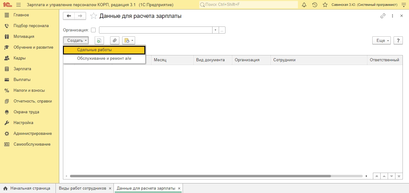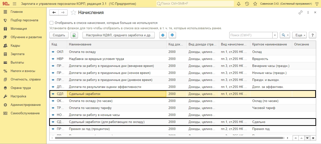 В справочнике начислений появились нужные нам виды сдельной работы.