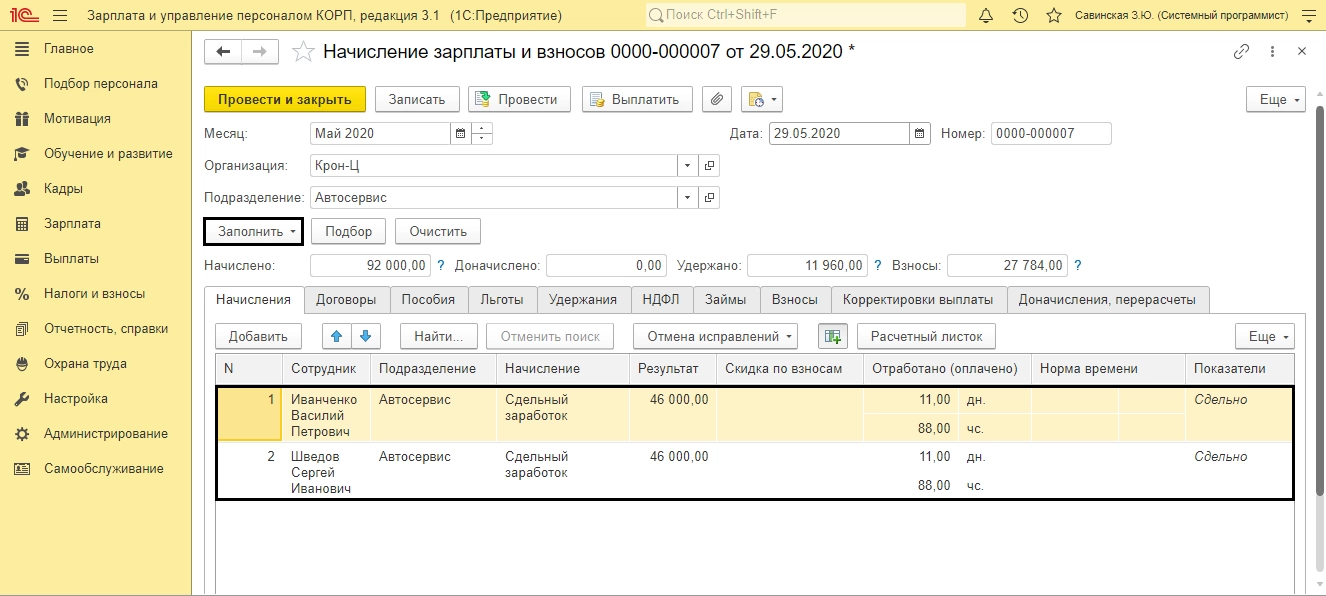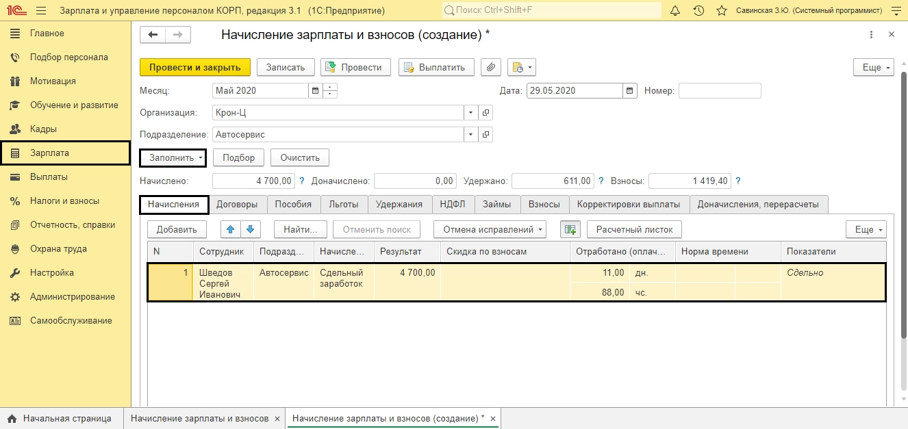 Сохраняем внесенные данные и переходим в «Зарплата-Начисление зарплаты и взносов». Нажмите «Заполнить» и во вкладке «Начислений» отобразятся нужные нам суммы.