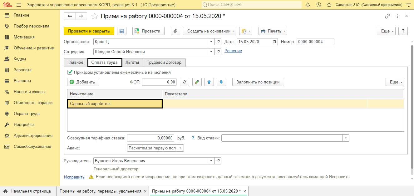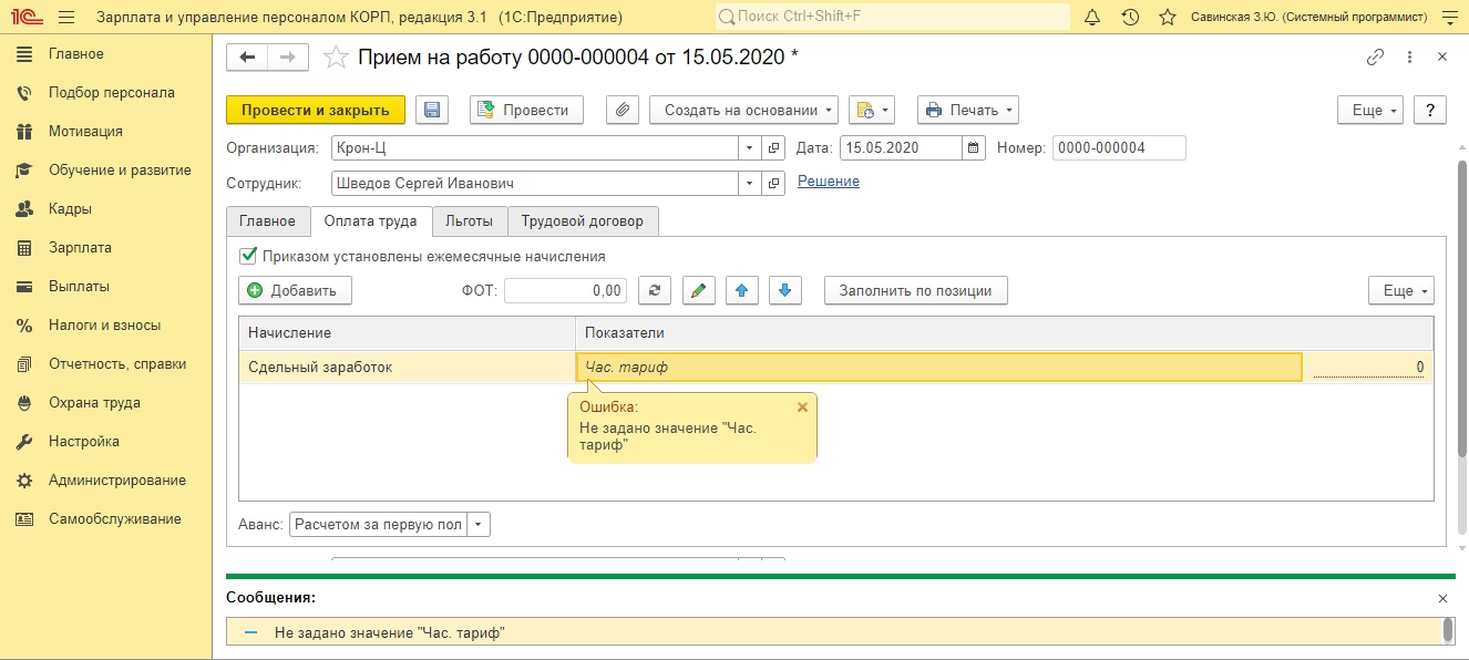 При приеме на работу или при кадровом перемещении на должность со сдельной формой платежей, задается тариф/оклад. Если в компании только сделка, то оклад или тарифную ставку задавать не надо. Но при проведении документа, программа не пропустит его, указав на ошибку – Не задано значение «Час тариф».