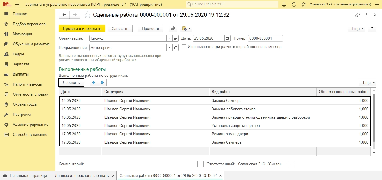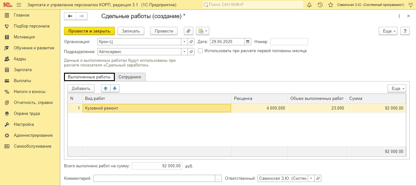 После завершения этого процесса, создайте документ «Сдельные работы» с двумя вкладками. На первой отразите сделанное работниками (у нас – работы по кузовному ремонту автомобиля в количестве 23 шт.). В таблице, исходя из расценок, внесенных в справочник, посчитана общая сумма платежей за данные работы.