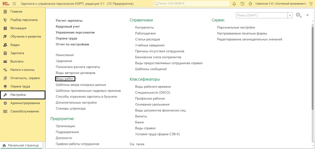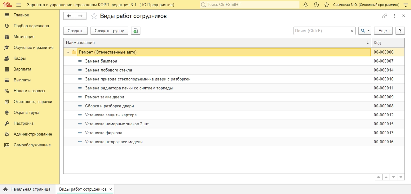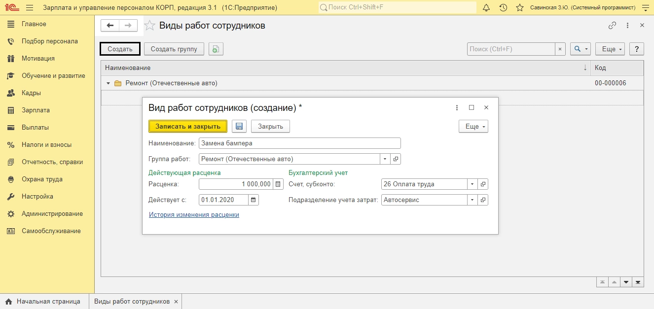 Рассчитаем величину сдельной оплаты, имея в виду стоимость выполняемых работ, в «Настройка-Виды работ».