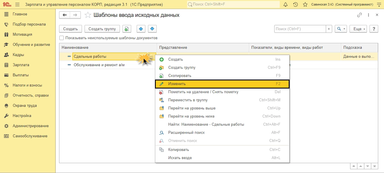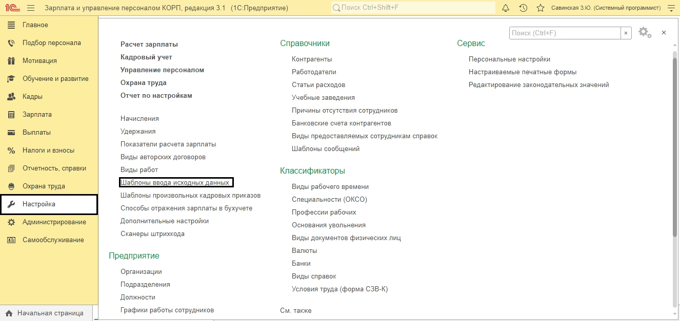 В справочнике «Настройка» найдем шаблон ввода параметров для отображения сдельных оплат.