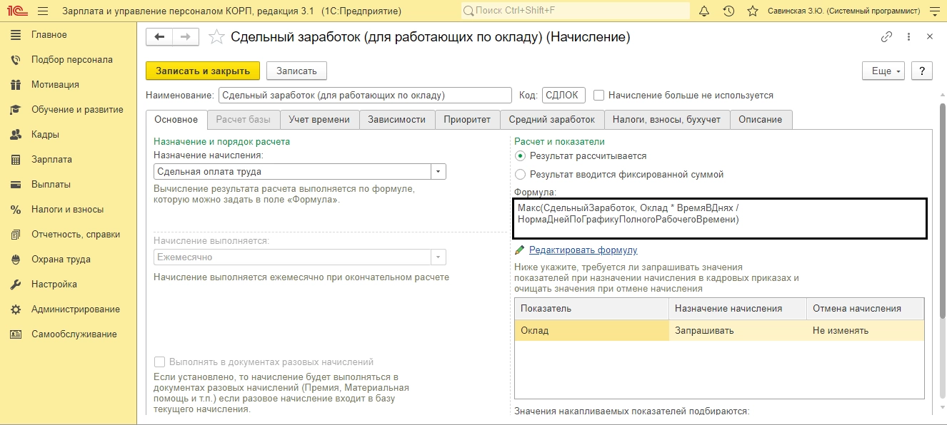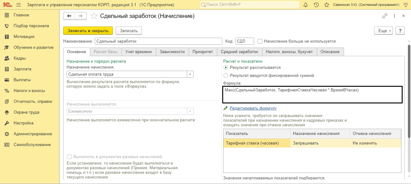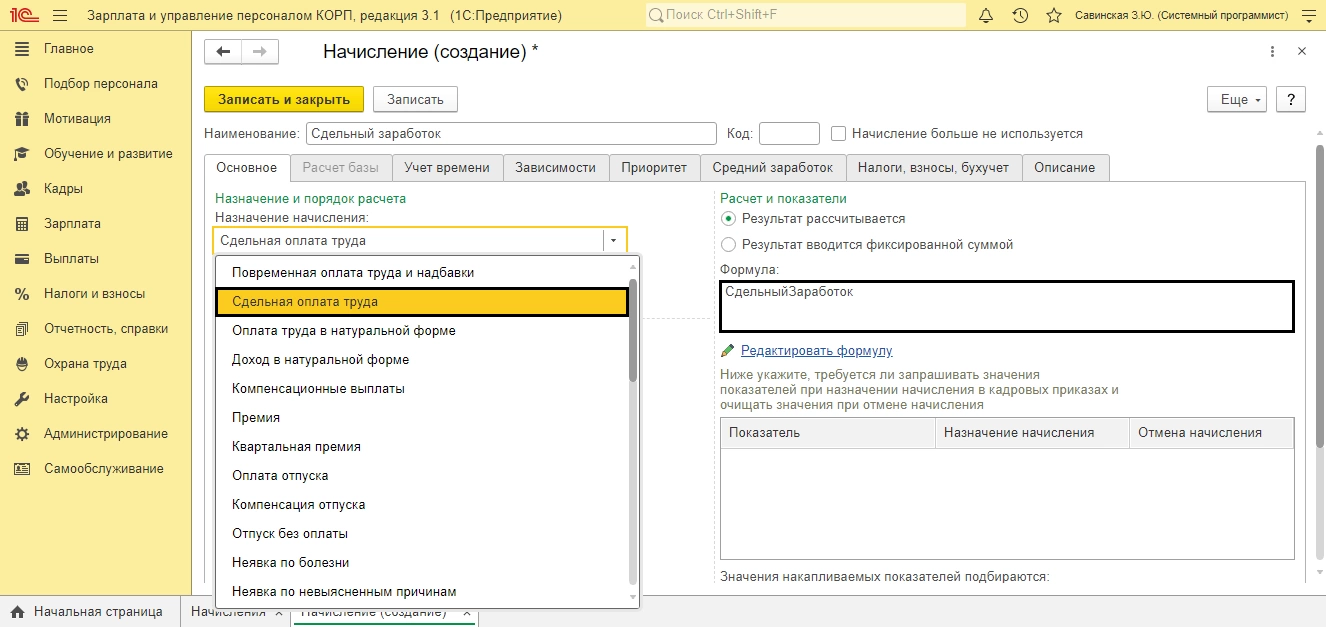 Сформируем новый вид начисления, не указывая в формуле варианты сравнения, через «Начисления-Создать». Проставляем «Сдельная оплата труда». В формуле отобразится используемый показатель – СдельныйЗаработок.