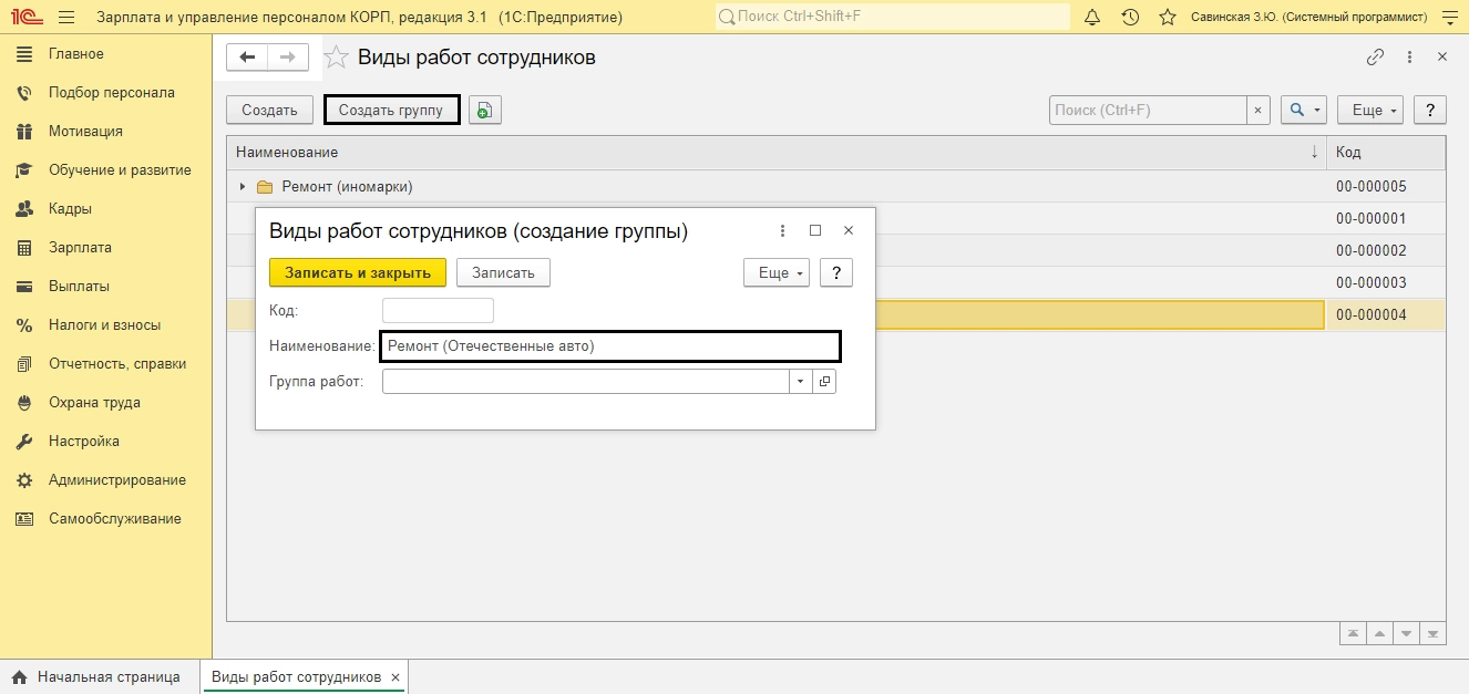 Здесь можно объединить виды в группы – разложить по папкам, для чего жмем соответствующую кнопку и указываем наименование нашей группы. Для примера создадим группы для работ, выполняемых автосервисом – «Ремонт (отечественные авто)» и «Ремонт (иномарки)».