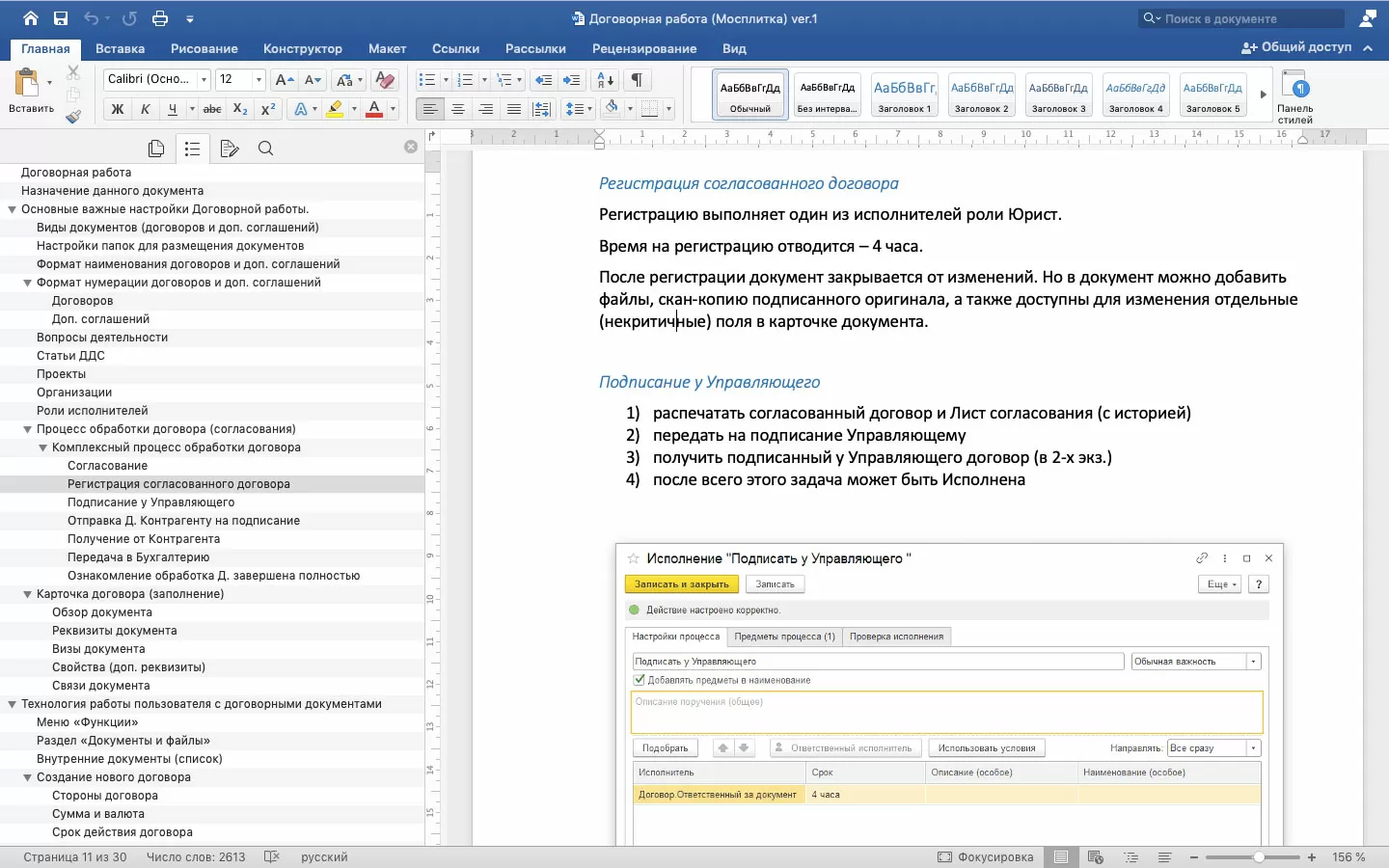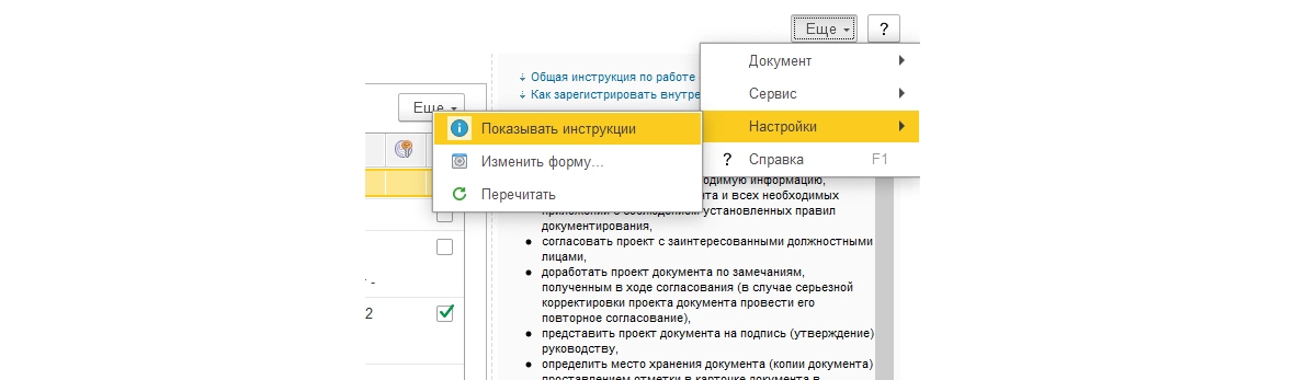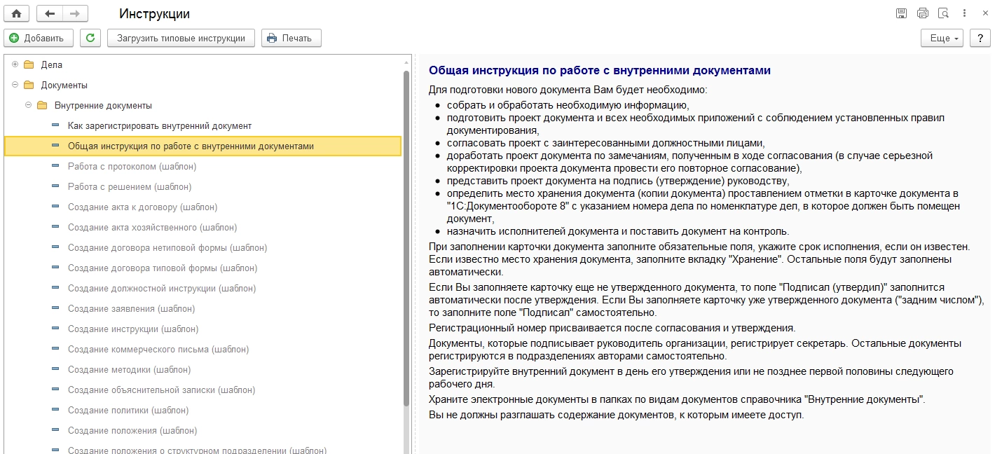 Как и во всем нужно придерживаться разумного подхода в подготовке правил и регламентов. Они могут быть созданы в любой приемлемой для организации форме. Они должны быть максимально простыми и понятными всем. А также должны быть доведены до всех участников СЭД. «1С:Документооборот КОРП» предлагает функционал встроенных инструкций. Для каждого объекта в зависимости от набора параметров (организация, состояние документа, шаблон документа) могут быть загружены необходимые для пользователя инструкции. Можно загрузить и стандартные инструкции от разработчиков и методистов фирмы «1С».
