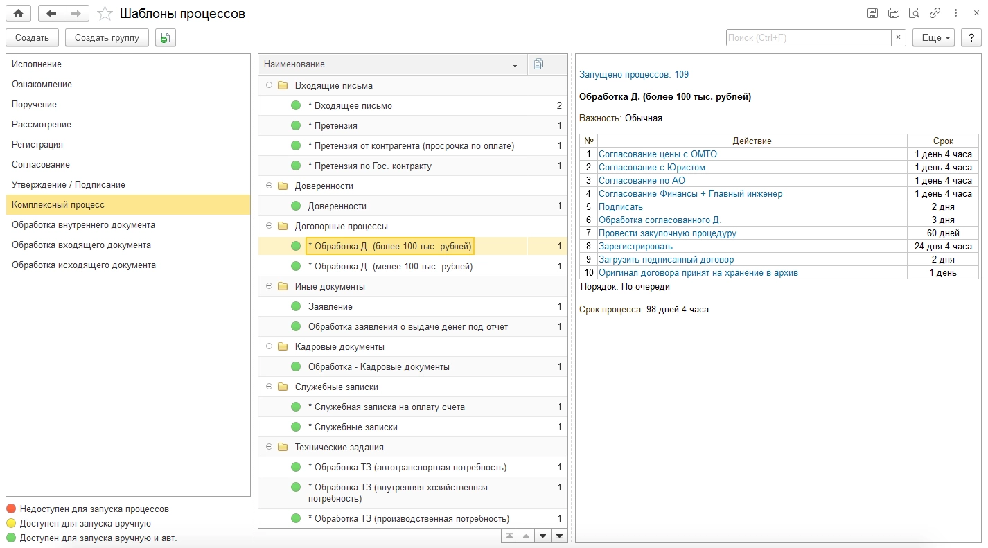 - Задание маршрутов обработки. Настройка процессов, назначение их соответствий документам, условий старта, состав исполнителей, условия, при которых они включаются в работу;