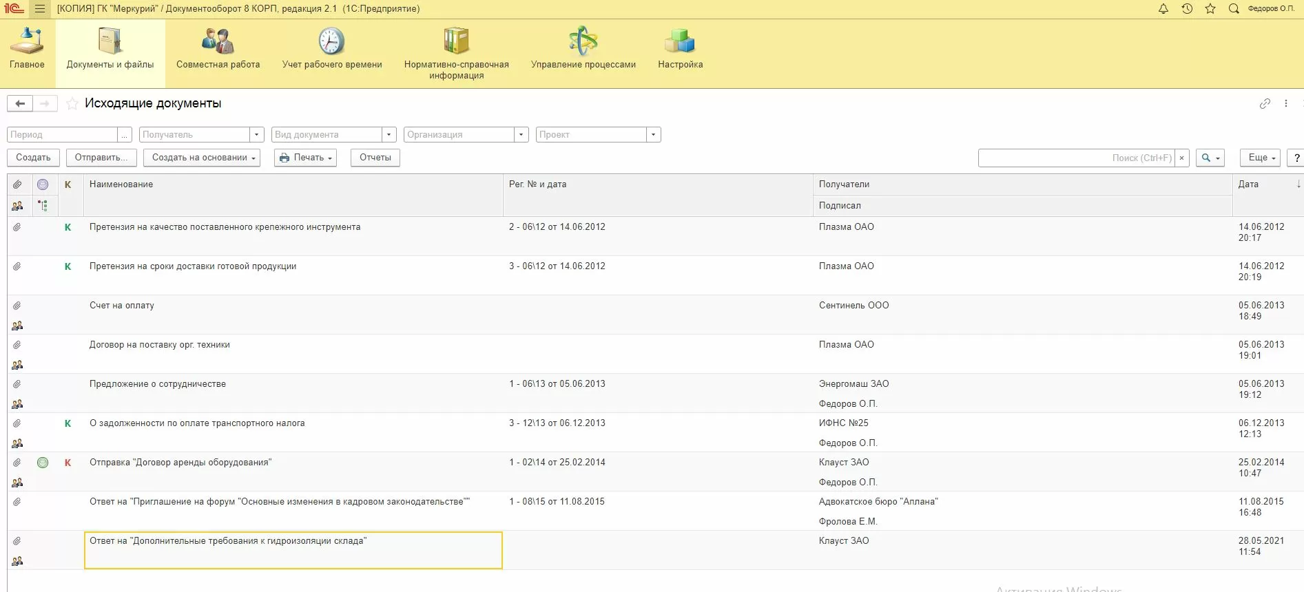 Создается такой документ инициативно, в ответ на входящий документ, или автоматически (1С самостоятельно присваивает статус входящему документу «Отправлен ответ»). Исходящие документы также отображаются в журнале. Для простоты и удобства работы с входящей/исходящей документацией в 1С:ДО создаются цепочки документов.