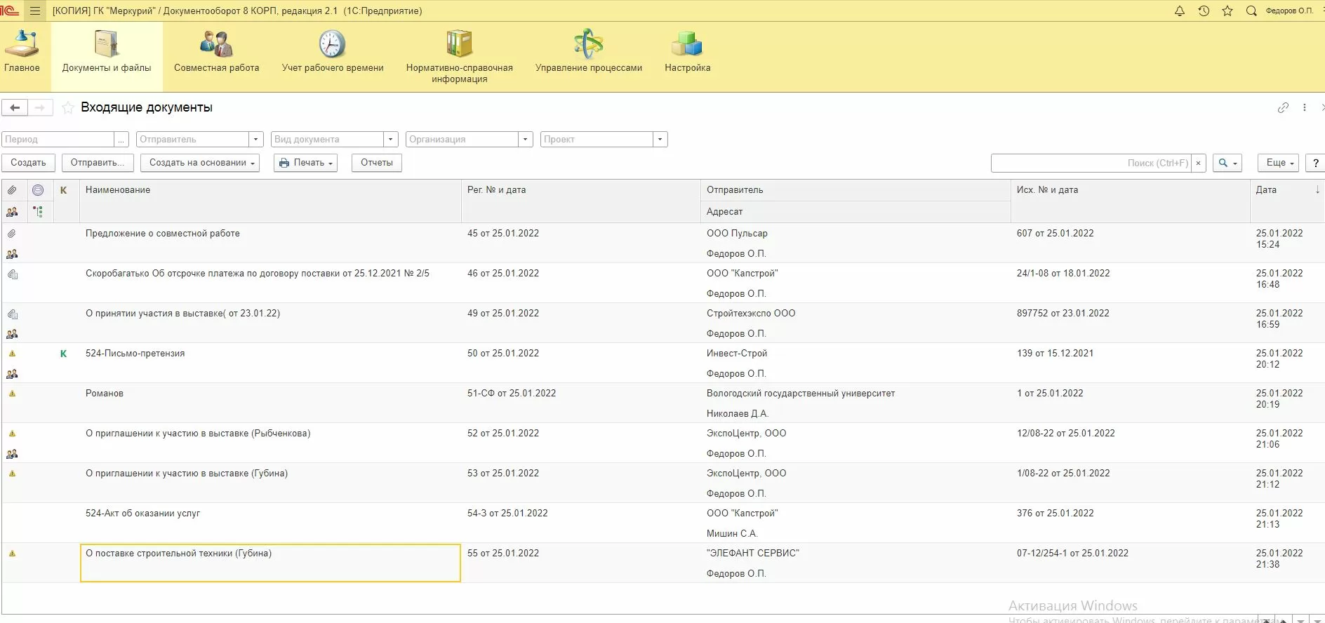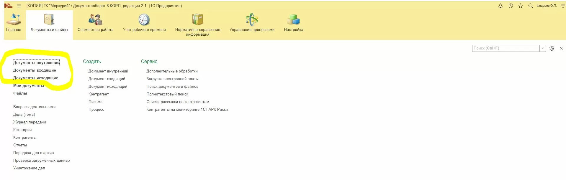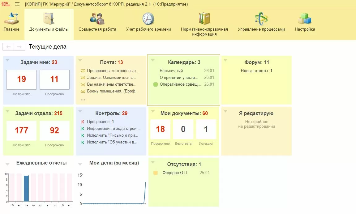 Для автоматизации ДО в 1С существует возможность всего комплекса действий для обеспечения делопроизводства на предприятии: