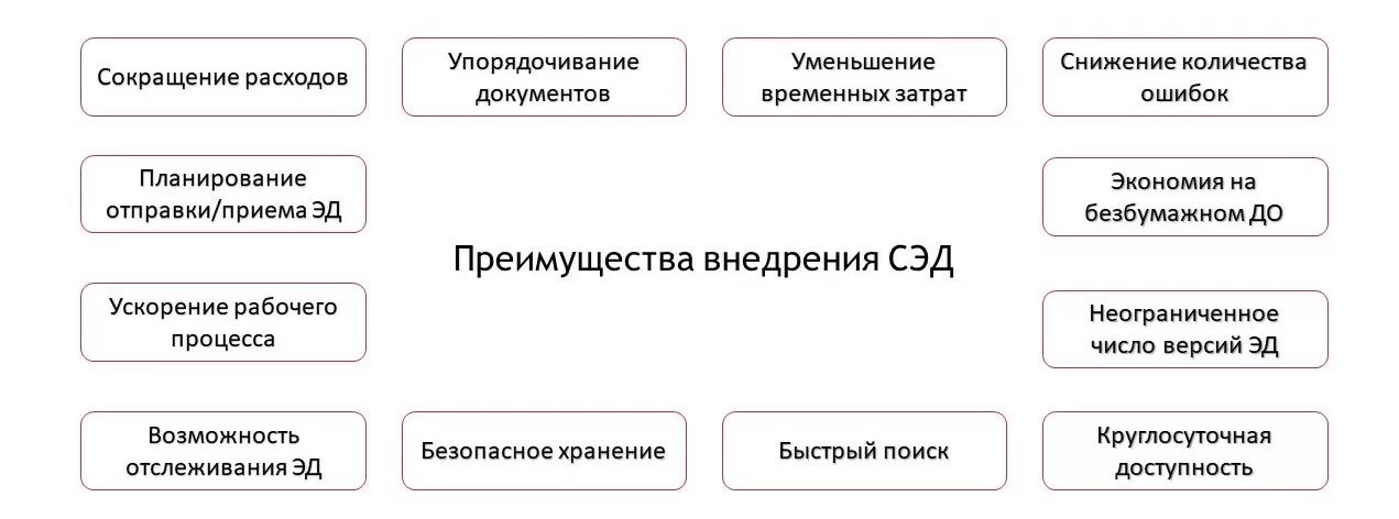 Переход на электронный ДО способствует снижению затрат на канцелярию и оргтехнику, пересылку почтовыми и курьерскими службами, хранение бумажных документов. Возникает возможность полного отказа от бумажной документации.
