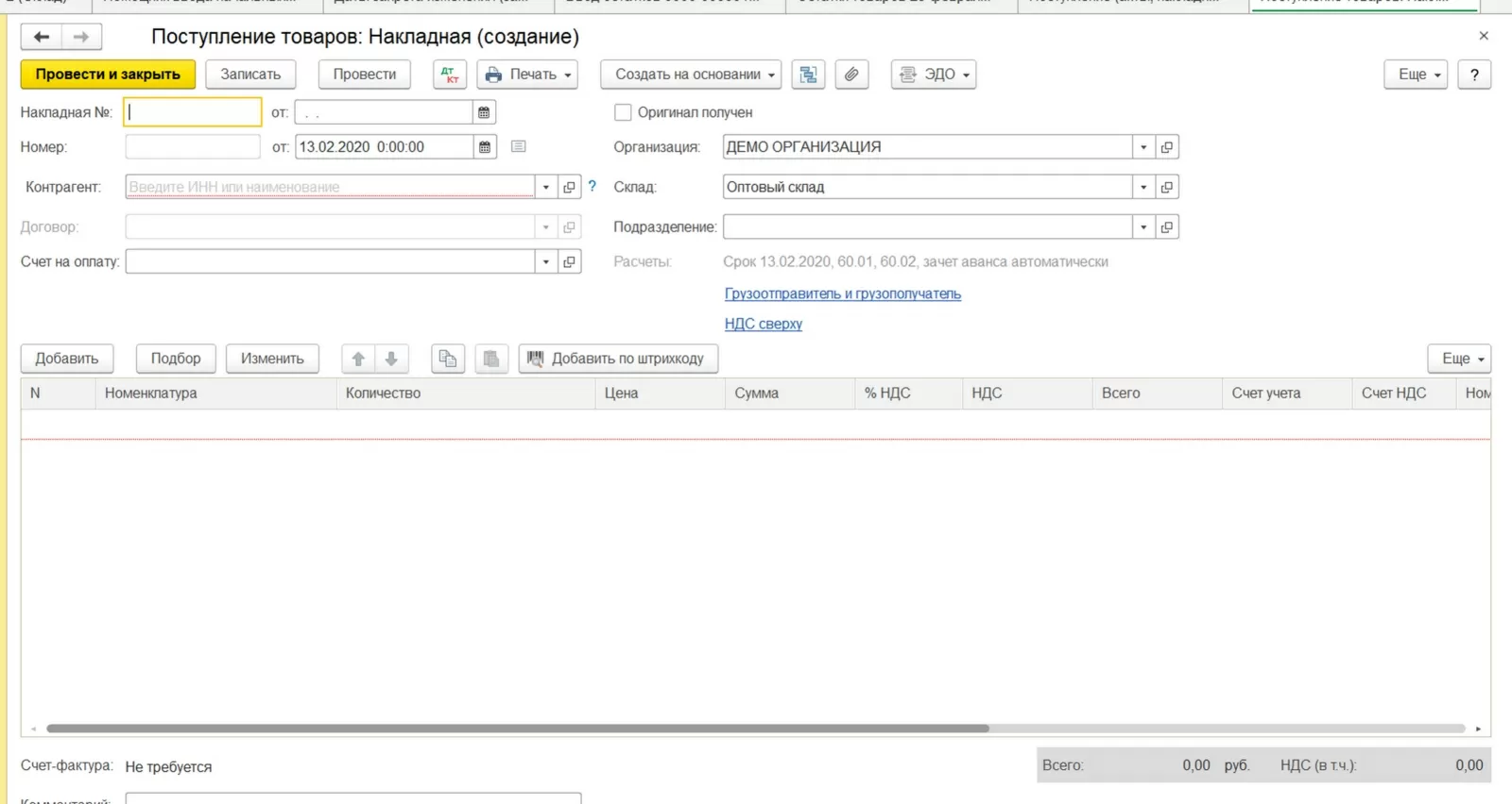 Последовательно заполняются поля номенклатуры, количества и стоимость.