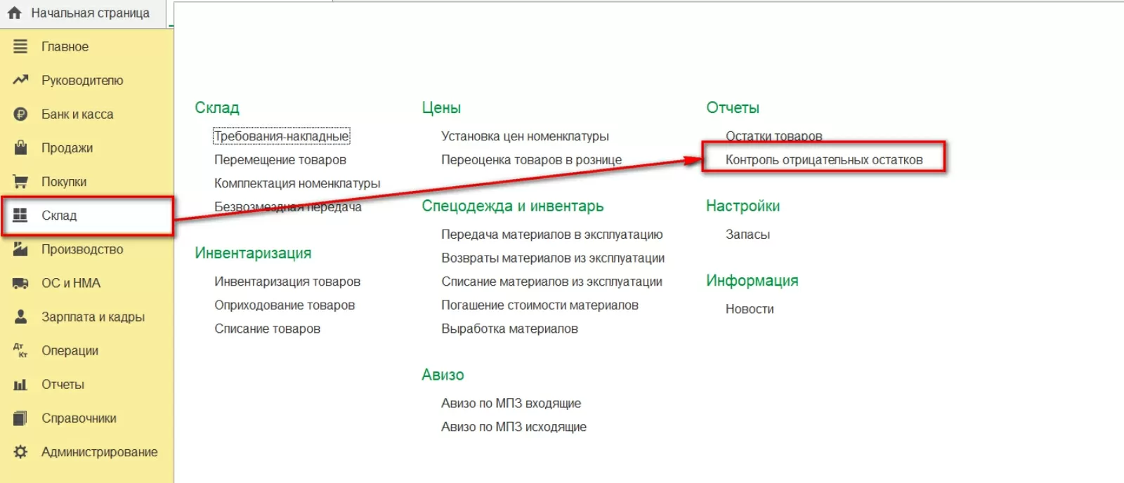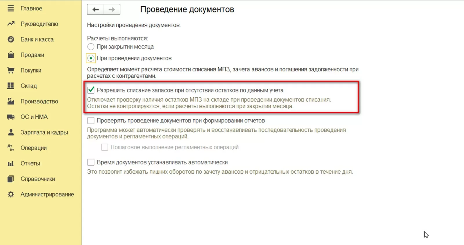 Если убрать данную галочку, программа установит запрет на проведение документа на списание материалов. Ниже мы расскажем, как в системе осуществляется контроль отрицательных остатков.