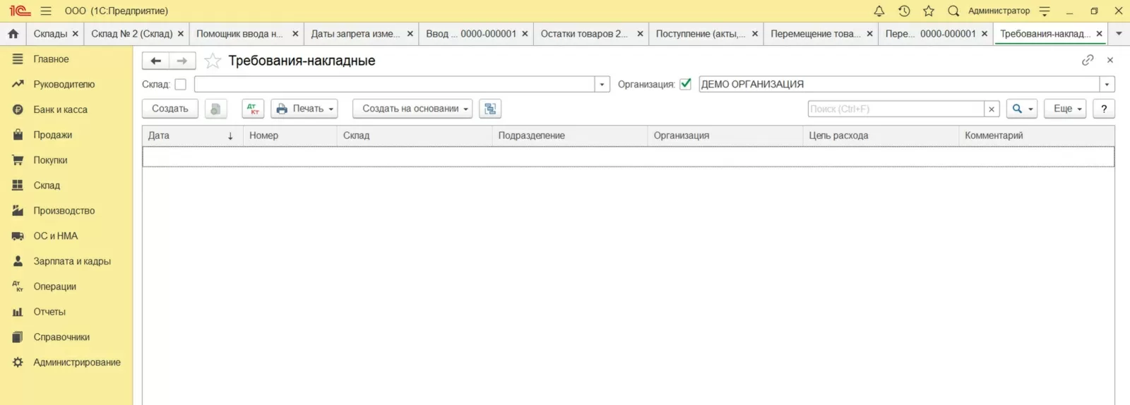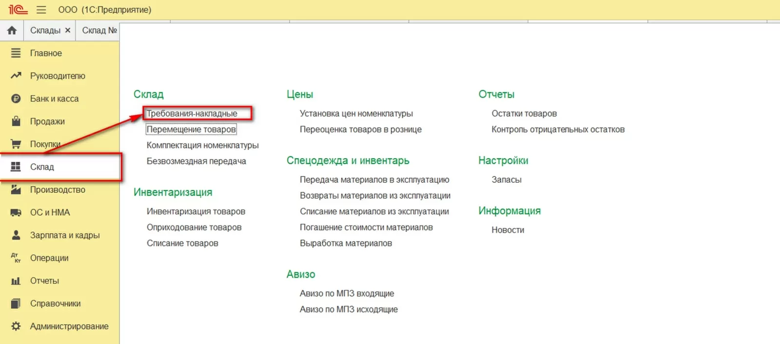 Для его оформления необходимо перейти в раздел «Склад», затем подраздел «Склад», далее найти строку «Требования накладные».