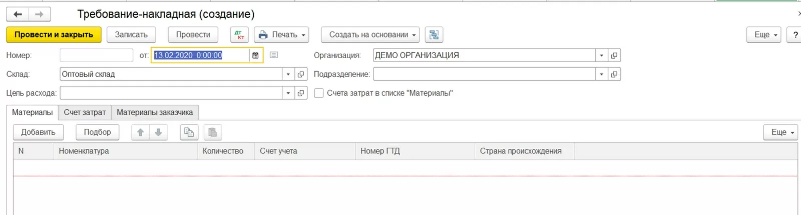 Программа 1С для складского учета максимально упрощает процедуру выбытия материалов и товара со склада. Далее рассмотрим пример списания в производство материалов. Списание материала в производство оформляется документов «Требование-накладная».