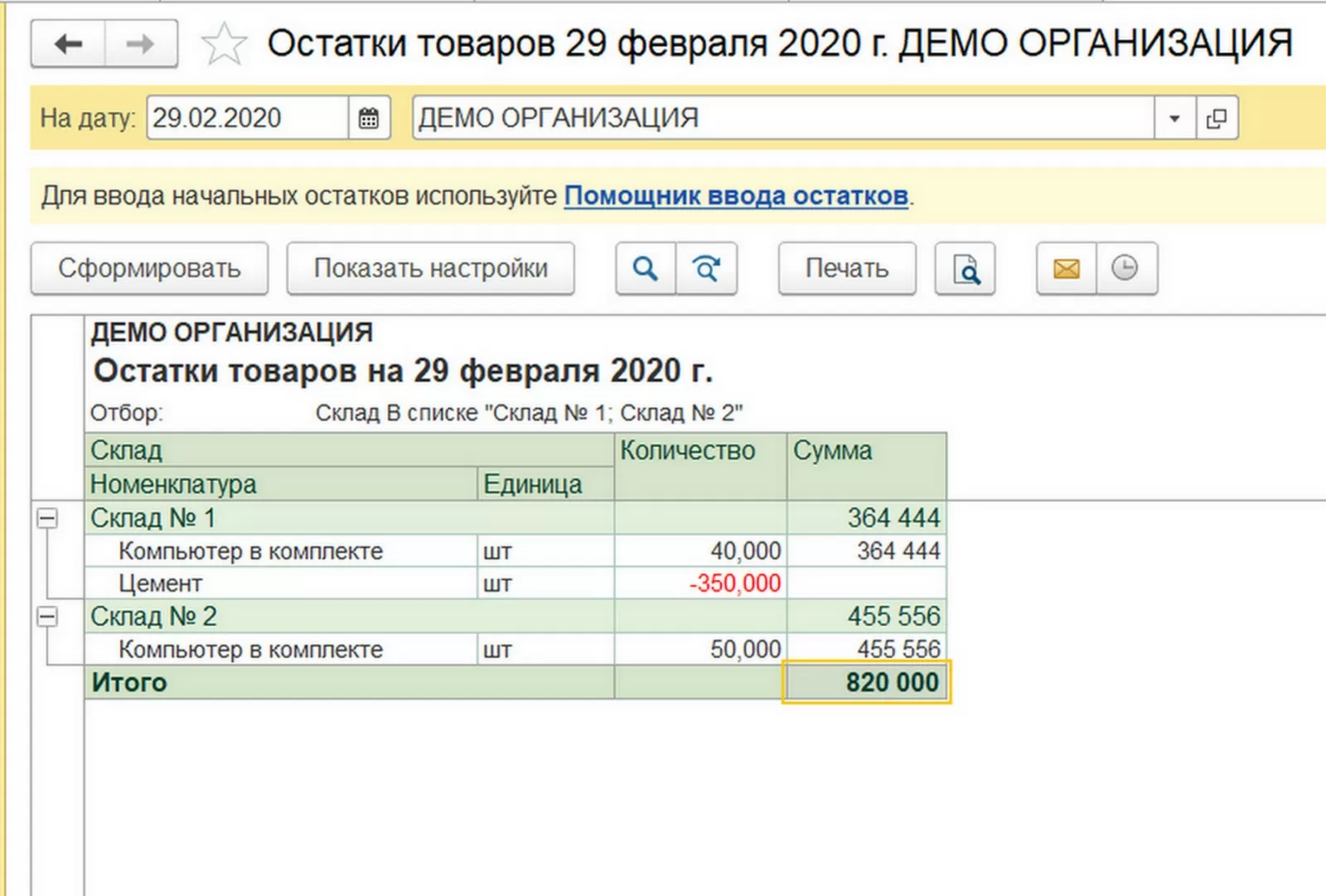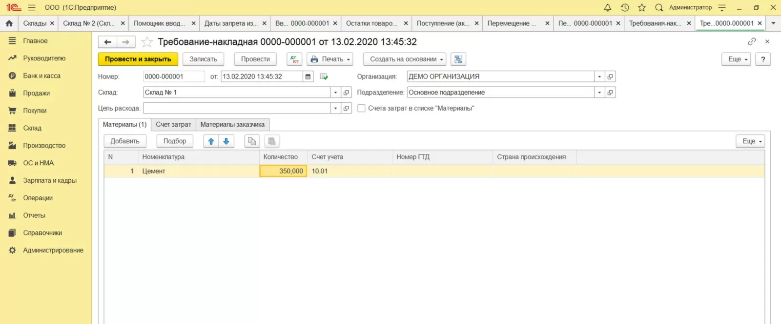Так мы спишем 350 кг цемента в производство и сформируем остатки товаров.