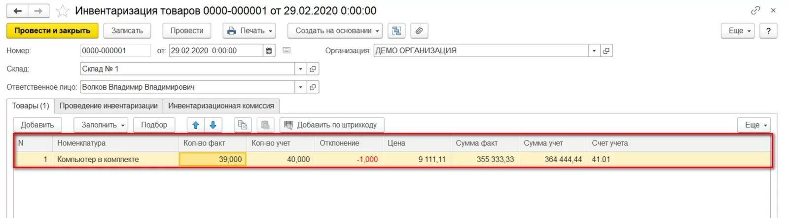 Нажатием кнопки «Заполнить» в документе отражаются сведения по остаткам на основании данных бухгалтерского учета. Напомним, что после перемещения товаров у нас на складе оставалось 40 «Компьютеров в комплекте». Предположим, что фактически на складе оказалось 39 компьютеров. Для этого редактируем графу «Количество фактическое». Программа автоматически рассчитывает сумму отклонения со знаком минус и выделением красным цветом.