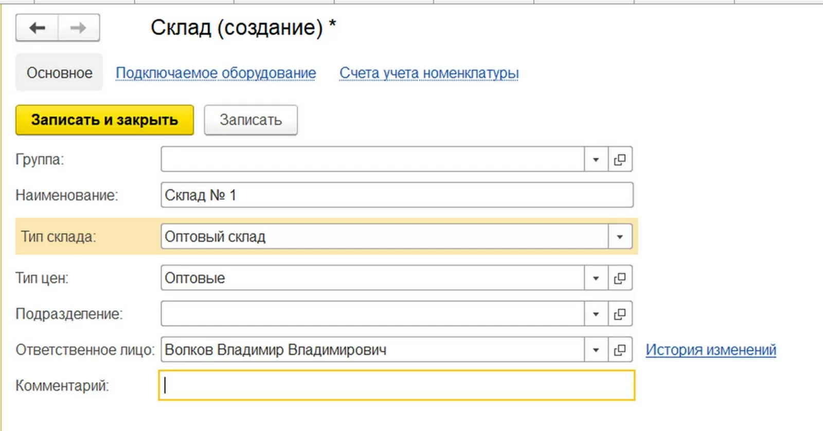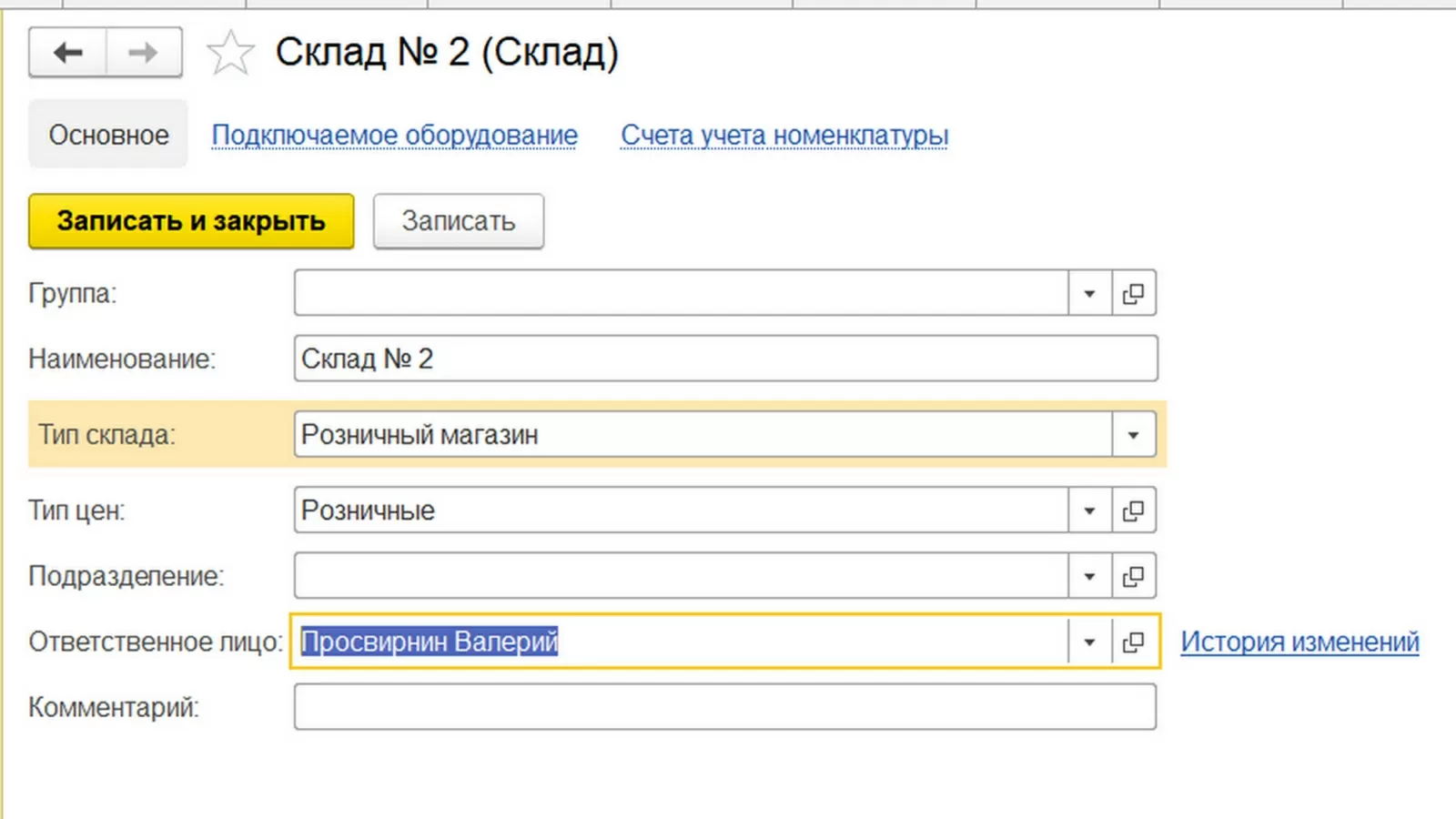 Последовательно заполняем поля группы, наименования, ответственного лица. Аналогично создаем Склад №2 с указанием наименования как «Розничный».