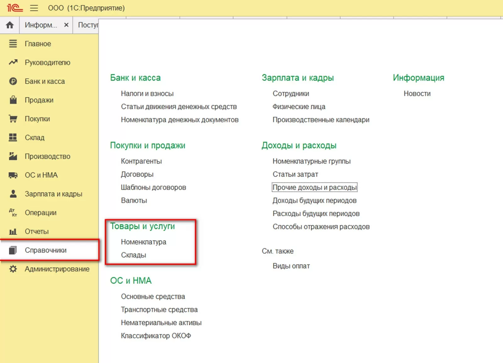 Если у компании несколько складов, настройку складского учета необходимо начинать с введения двух и более мест учета. Для этого нужно в меню «Справочники» - «Товары и услуги» найти раздел «Склады».