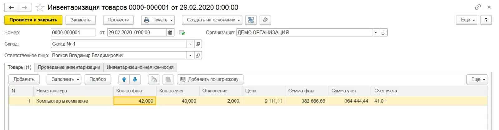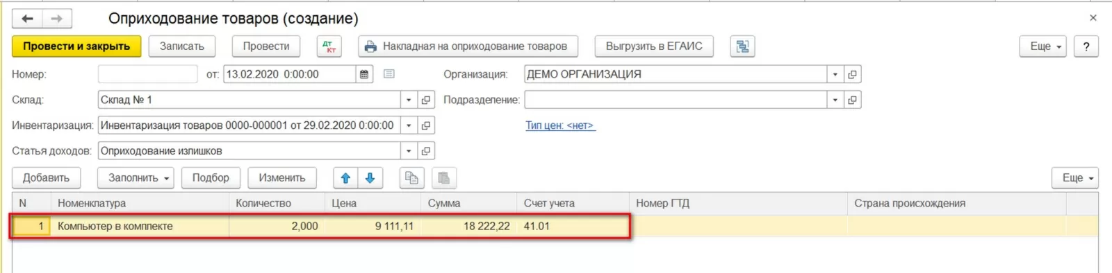 Предположим, что по результатам инвентаризации у нас наоборот возник излишек в 2 компьютера.