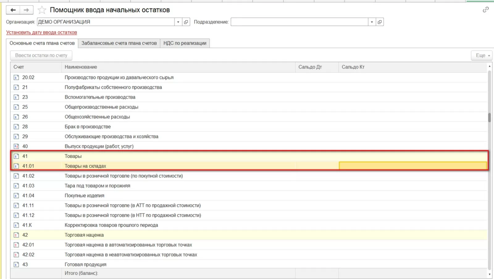 Открывается окно помощника ввода остатков, в котором мы выбираем остатки, по какому счету мы хотим ввести. В нашем случае это счет 41 «Товары».