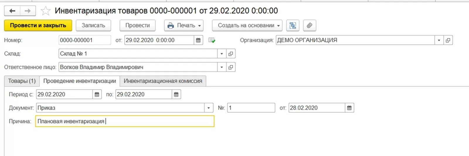 Далее последовательно заполняем вкладку «Проведение инвентаризации», указывая период проведения, документ, а также причину проведения инвентаризации.