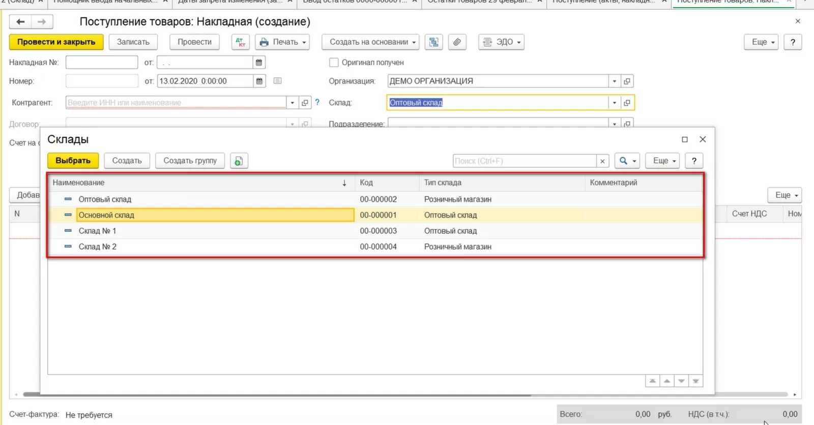 Наведение курсора на строку «Склад» приводит к возможности выбора, на какой именно склад оприходовать поступающий по накладной товар.