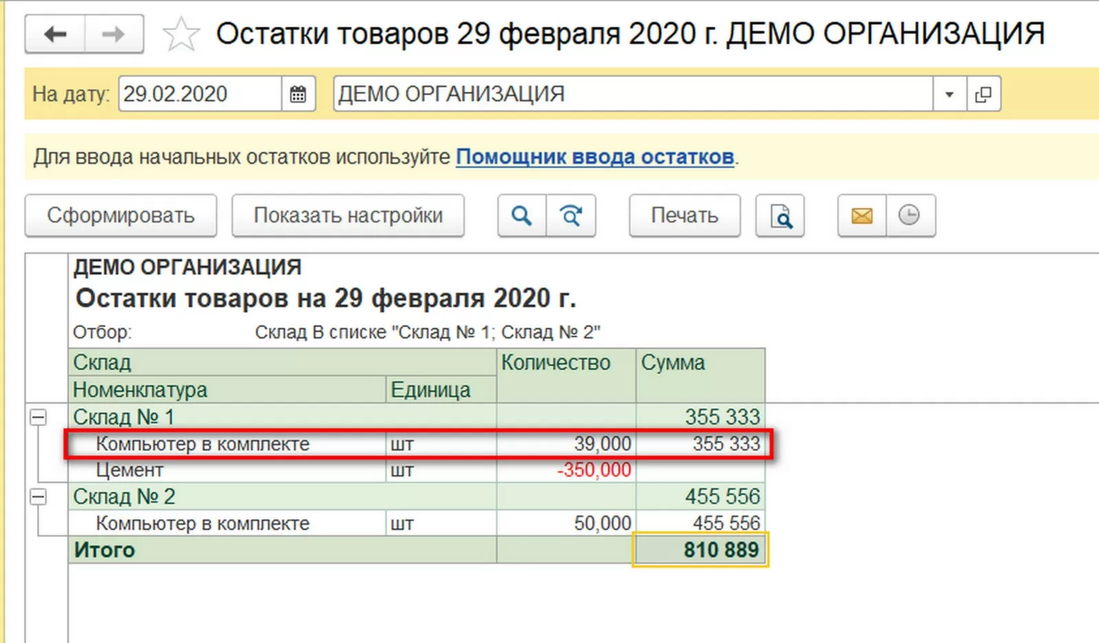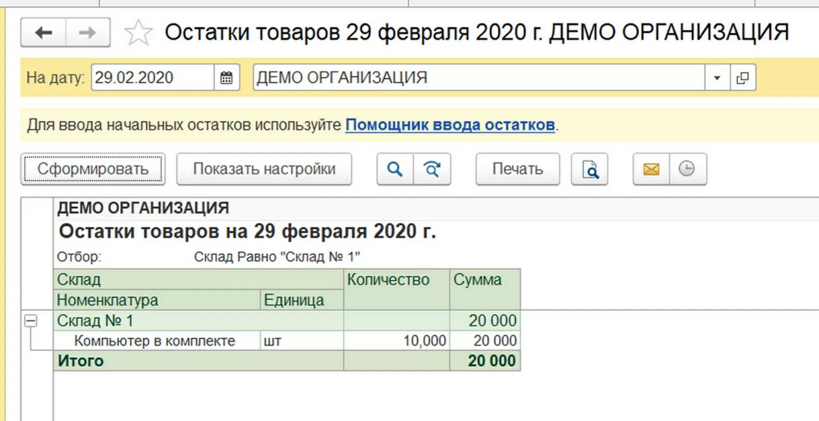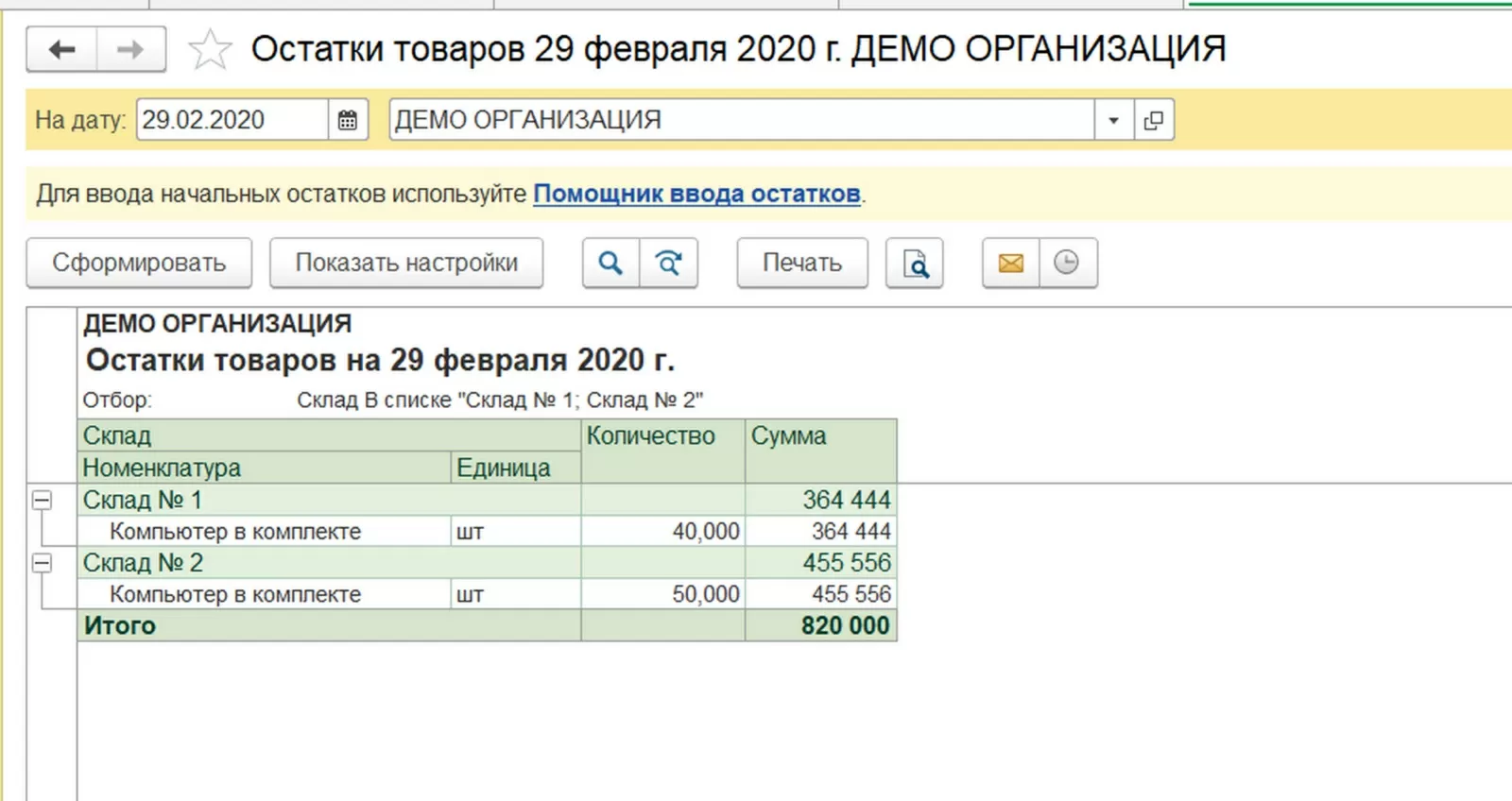 Далее проверим остаток, сформировав отчет «Остаток товаров» по складу, после проведения списания одного компьютера.