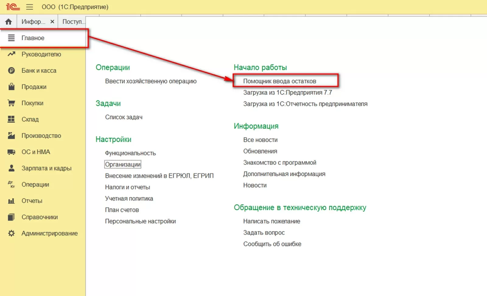 Для корректного учета необходимо ввести остатки на начало года. Для этого в меню «Главное» находим вкладку «Помощник ввода остатков».