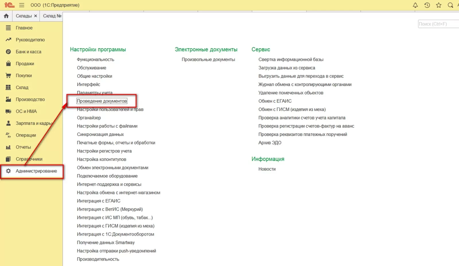 Обратите внимание! Мы специально проставили количество материалов, превышающее фактическое наличие на складе. Система позволяет списать материалы с превышением, так как нами в меню «Администрирование» - «Проведение документов» (Рис.19) установлена галочка в строке «Разрешить списание запасов при отсутствии остатков по данным учета».