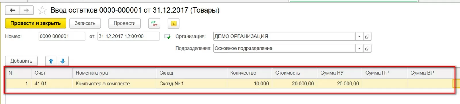 Дата документа 31.12.2017 года устанавливается автоматически, так как у нас в настройках задано, что остатки были видны на 01.01.2018 года (если дата документа будет 01 января, сумма остатков попадает в обороты текущего года).