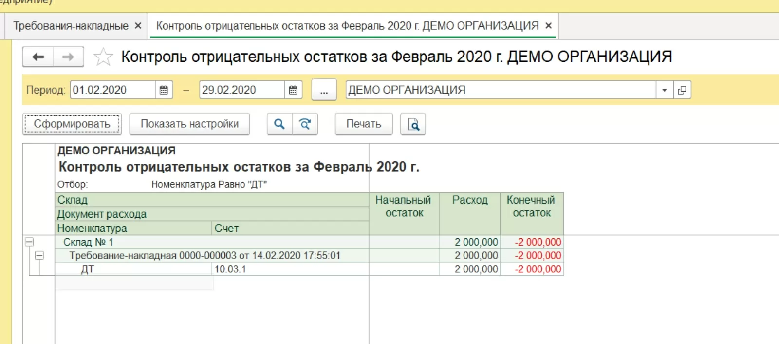 Когда контроль отрицательных остатков отключен, этот отчет позволяет эффективно и своевременно отследить поступление и отражение в бухгалтерском учете материальных отчетов ответственных лиц, а также исключает пересортицу в номенклатуре товаров. В противном случае программа не дает провести соответствующий документ.