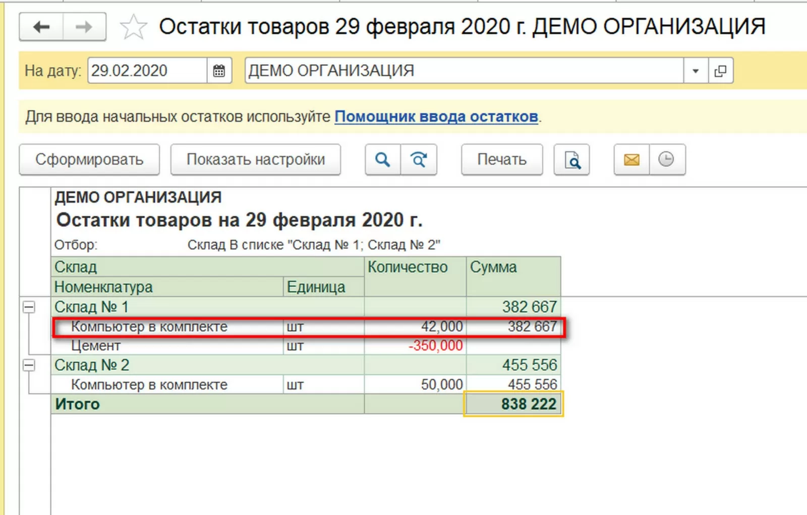 Сформированный после этого отчет по складу информирует нас о наличии уже 42 штук компьютеров на складе.