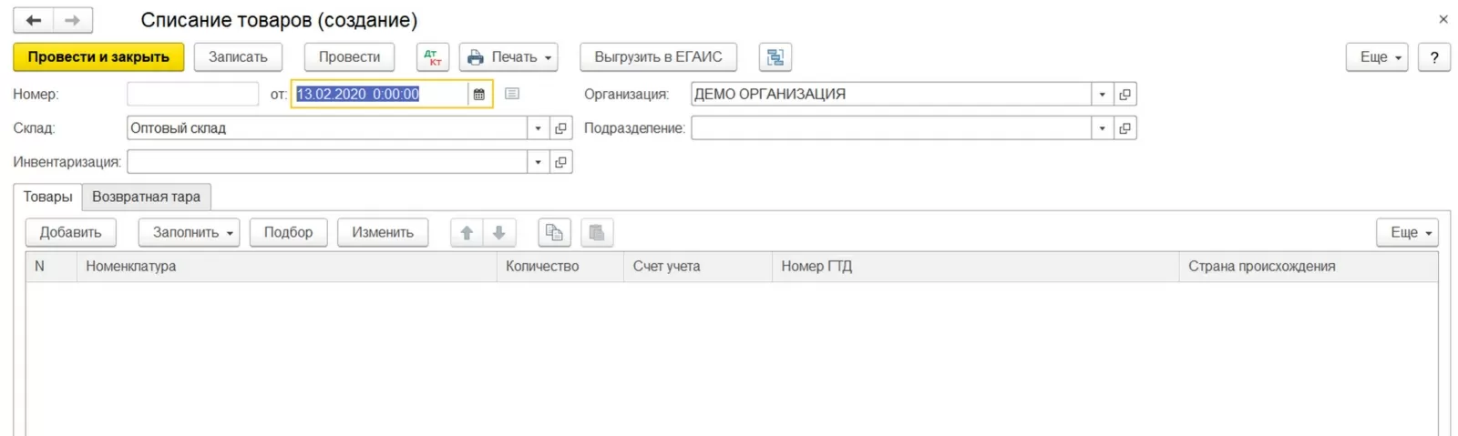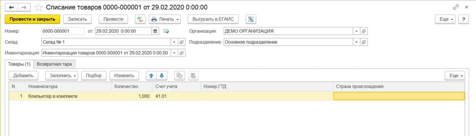 Для дальнейшего отражения в учете результатов инвентаризации нужно провести документ «Списание товаров».