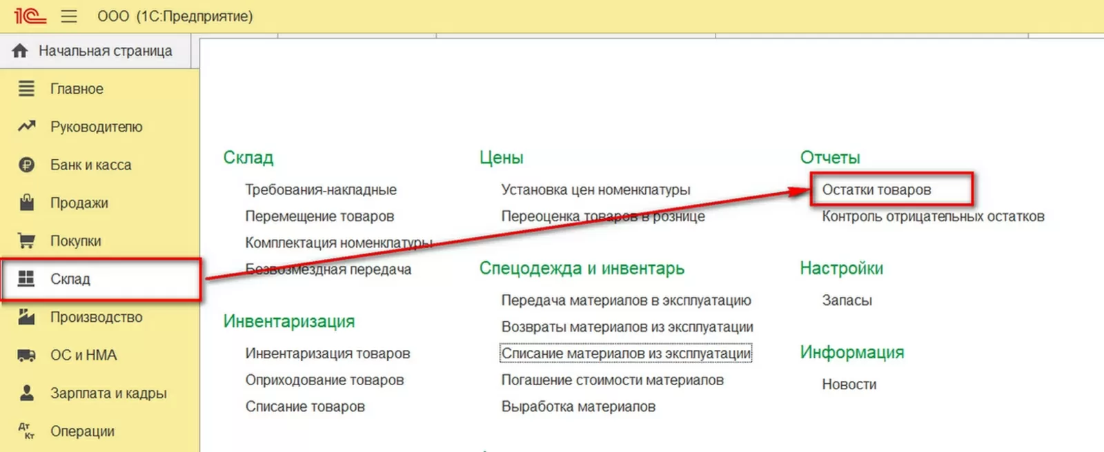 Остатки товаров можно проверить в меню «Склад» - «Отчеты» - «Остатки товаров».