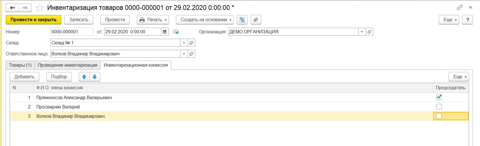 Далее необходимо заполнить вкладку «Инвентаризационная комиссия». Напомним, что ее состав должен включать не менее 3 человек и материально ответственное лицо. У нас это Иванов Петр Сергеевич.