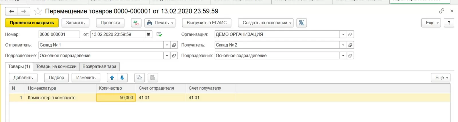 После заполнения даты перемещения товара заполняем графу «Отправитель», выбирая Оптовый склад, а затем графу «Получатель» – это в нашем случае Розничный склад. В строке «Номенклатура», пользуясь кнопками «Добавить» или «Подбор», переведем 50 штук «Компьютеров в комплекте» со склада «Оптовый» на «Розничный».