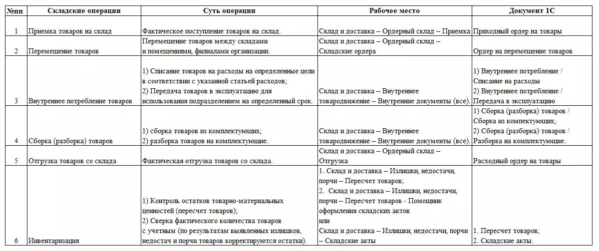 Основные движения товаров по складам, а также регулирующие движения документы приведены в таблице.