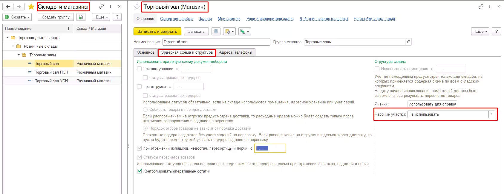 Настройка рабочих участков в 1С КА выполняется в карточке склада, на вкладке «Ордерная схема и структура» в поле «Рабочий участок» или в карточке помещения.