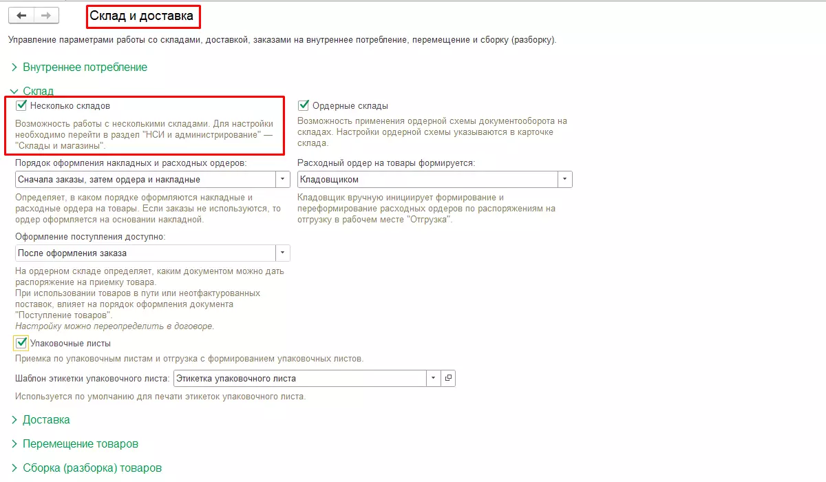 Для предприятия с несколькими складскими помещениями, прежде всего, необходимо произвести соответствующую настройку, активировав флаг «Несколько складов» в разделе НСИ и администрирование – Настройка НСИ и разделов – Склад и доставка.